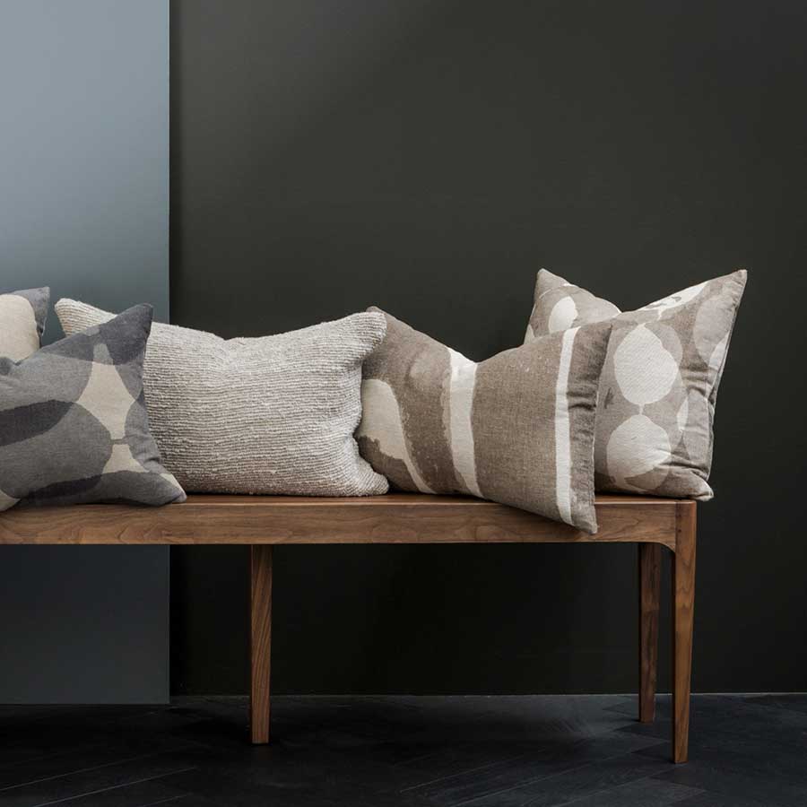 Made in Belgium, these cushions with abstract patterns have a sober and original appearance. They are made from Jacquard woven fabrics primarily of cotton, linen, and wool blended to create a play of textures and varied shaded tones. Mix and match freely with this luxurious and cozy collection.