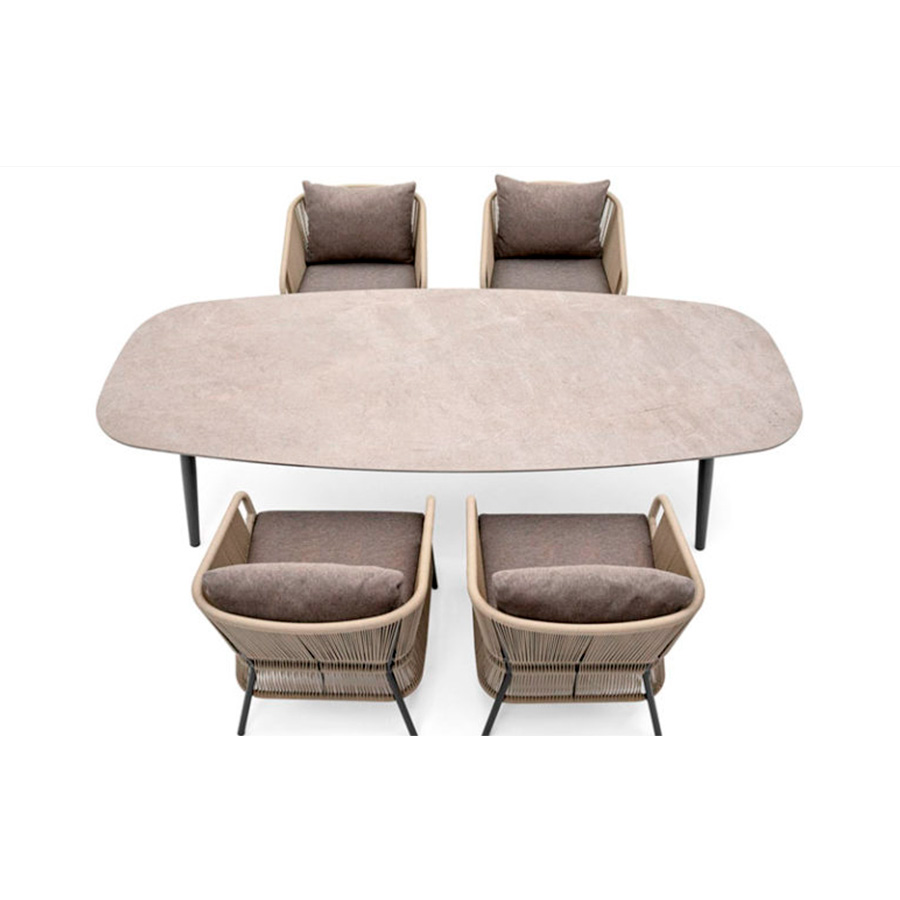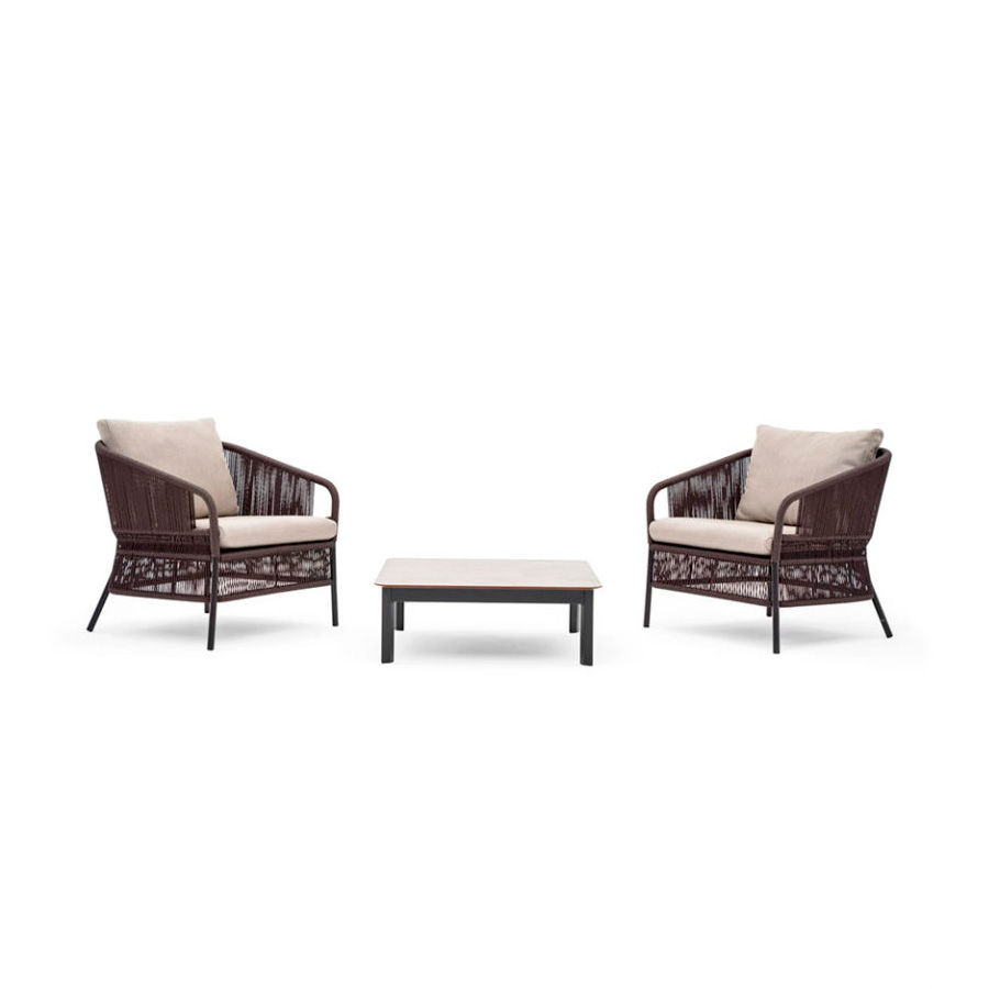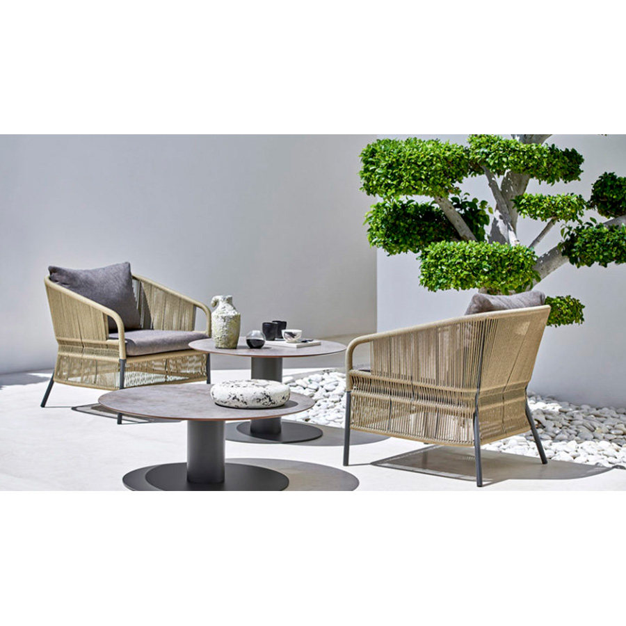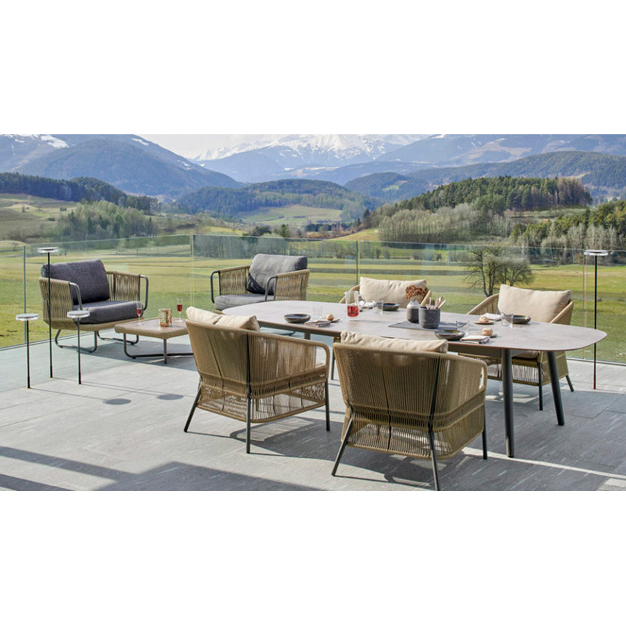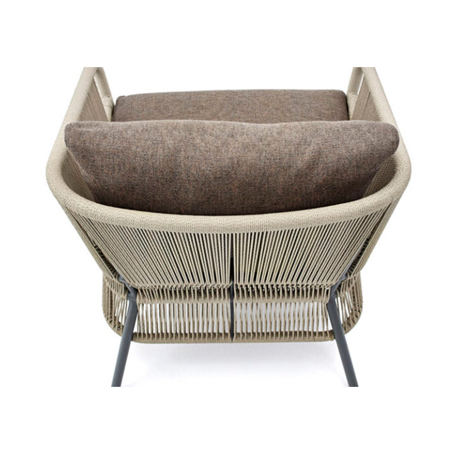 The lounge chair from the CRICKET collection is identified by its hand-woven rope backrest. Its twisting is a precious handcrafted element, a refined detail that emphasizes shape and design.