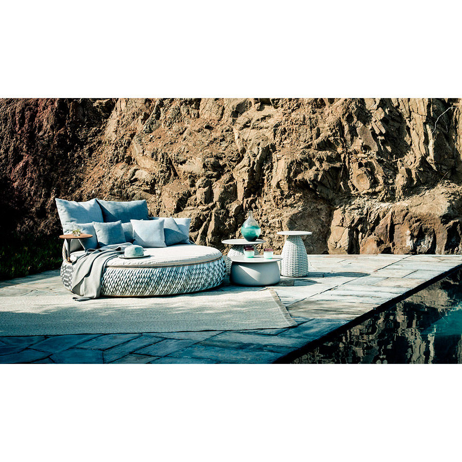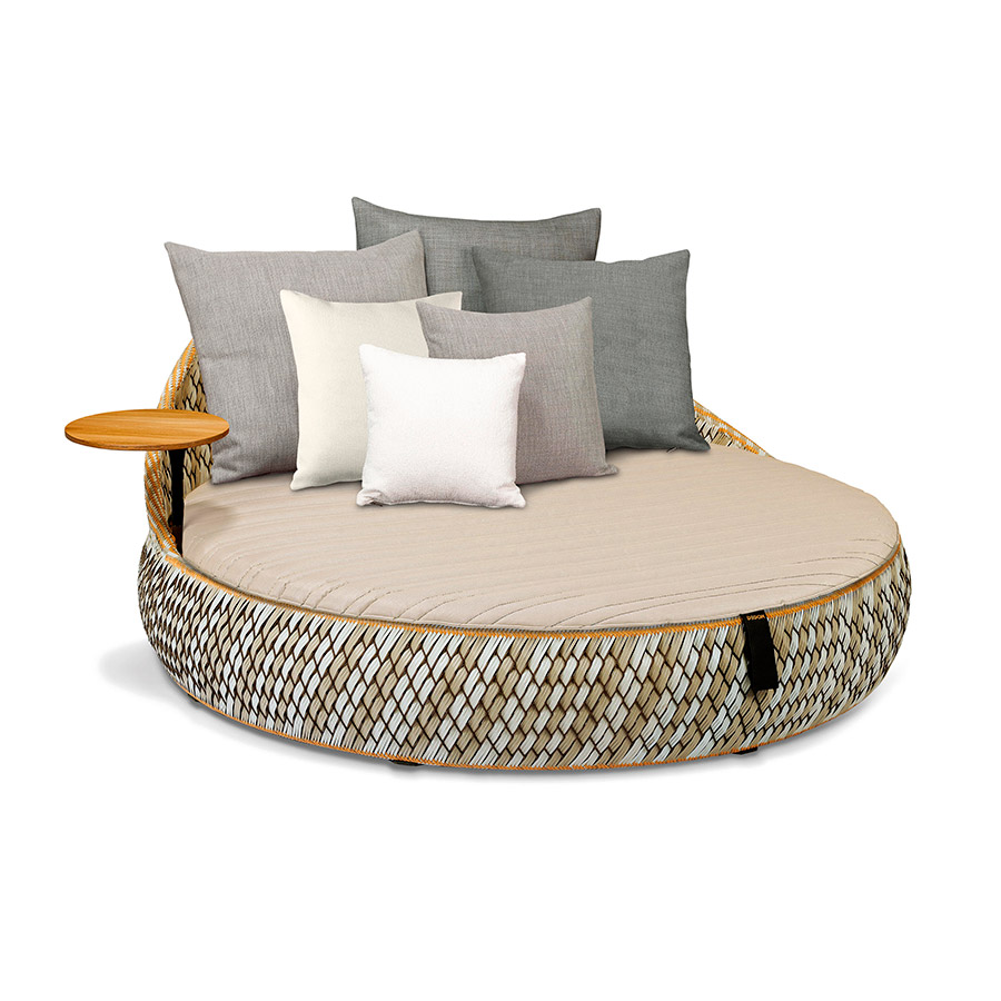The crafts and improvised seats of less industrialized countries inspire DALA. Surface and structure harmonize in this versatile collection by Stephen Burks. Each piece begins as a powder-coated aluminum mesh through which DEDON’s master braiders weave colorful strands of our newest, eco-friendly fiber.