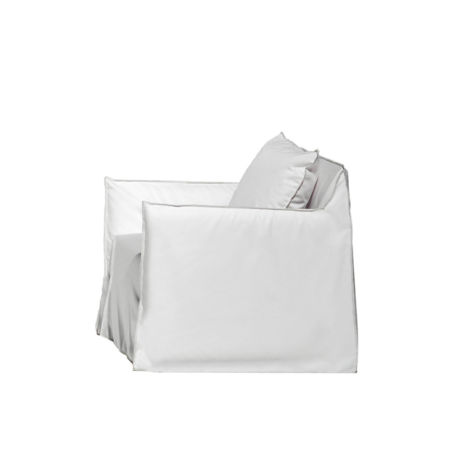 Family of upholstered sofas with removable covers, the Ghost Out 10/12/16 has a comfortable and enveloping seat, developed around a light frame with essential volumes. Designed to resist water and sunlight and retain their shape and aesthetics over time, they are available in different sizes, with two or three seats, and different seat depths. They are characterized by a geometric structure in which softness is accentuated thanks to loose cushions. Its main feature is the upholstery: a large cover whose profile is highlighted by visible seams for easy undressing and adopting a different image each time.