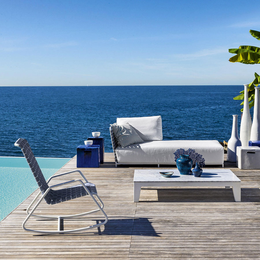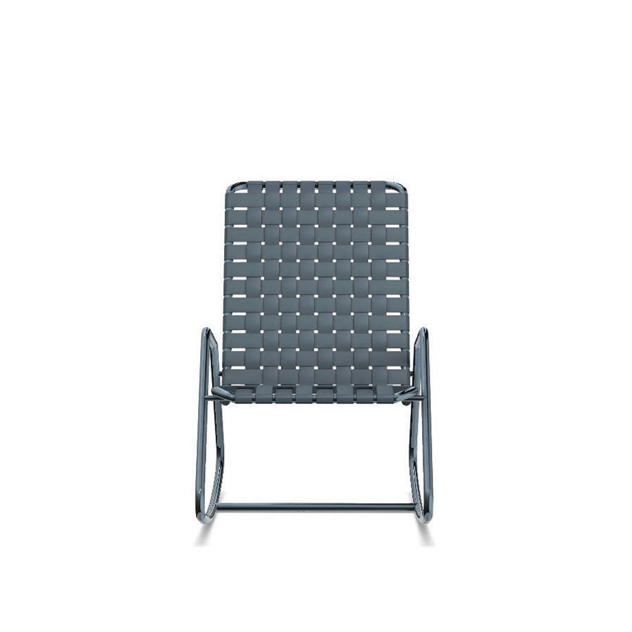 The essential and minimalist structure at sight reveals the Inout 809 rocking chair that develops around a light tubular aluminum structure painted white, gray, or sage, an ecological material unique for its technical qualities, evident in the trapezoidal legs. This adds a particular network of gray, black, or blue elastic bands, an innovative product based on synthetic rubber and propylene.