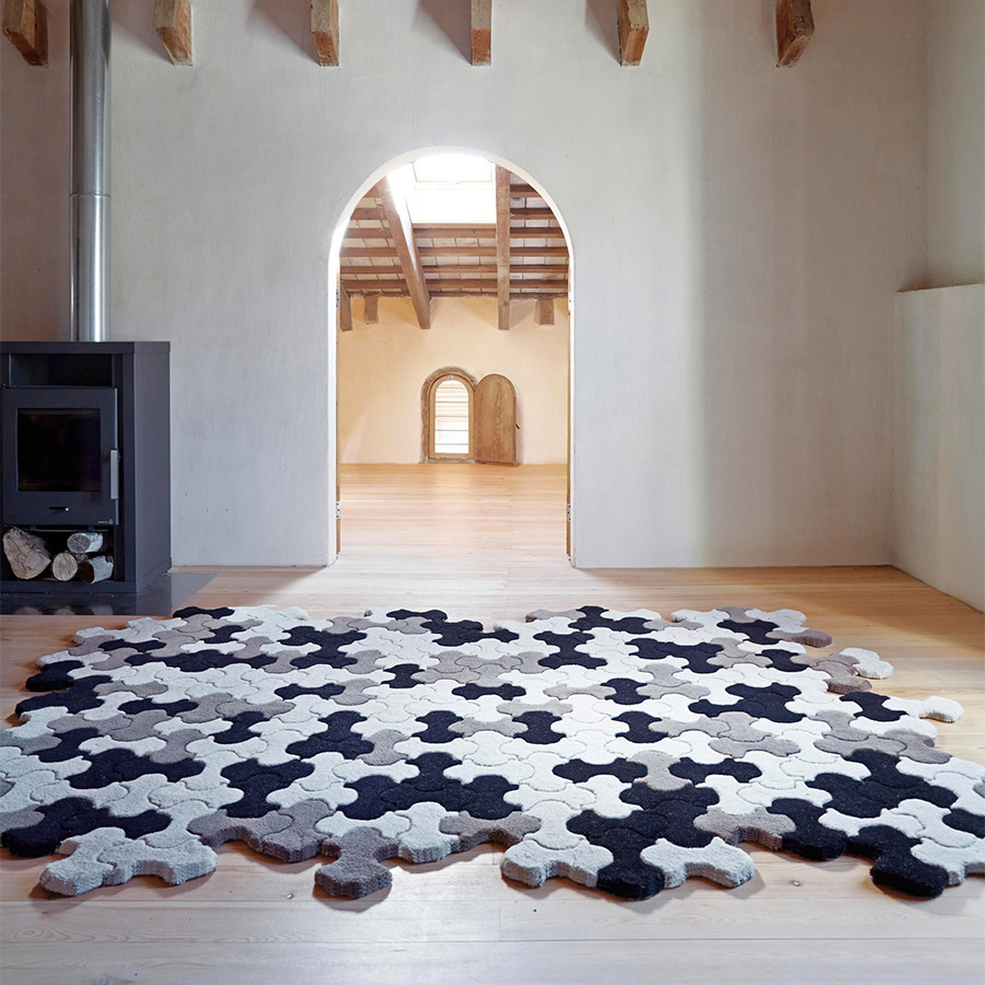 Another of its peculiarities is that the Pack rug does not present clear and delimited limits to use, but its edges are irregular, following the silhouette of the figure that represents a tile. It is a design by Jose A. Gandía-Blasco Canales, made with the innovative manual hand-tufted technique. It is available in two sizes.