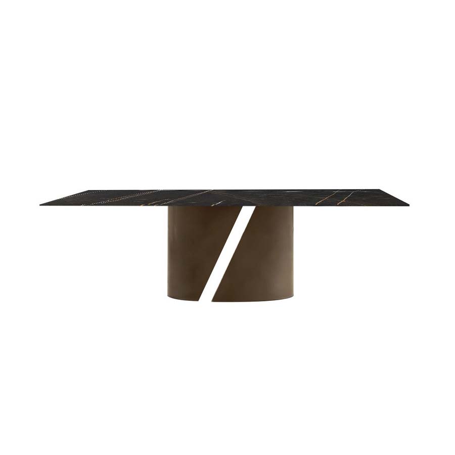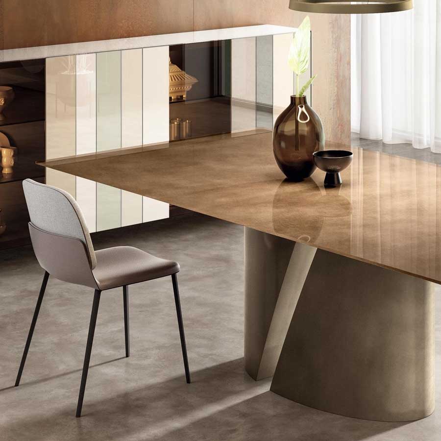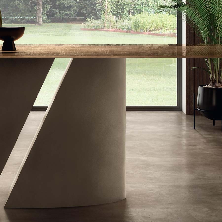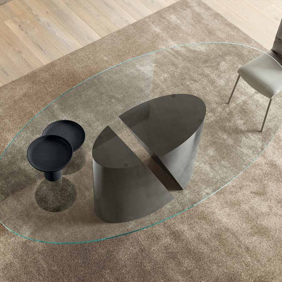 A clean cut divides the elliptical base of the elegant Wadi table into two sections and reveals an unexpected dynamism. The metal elements of the base are contrasted with the lightness of the thin tabletop, available in three shapes and in various materials: from Wildwood wood to glass and valuable finishes in marble, metal, wood, and XGlass fabric. In this way, the Wadi table communicates a fascinating formal rigor and a modern architectural impact.
