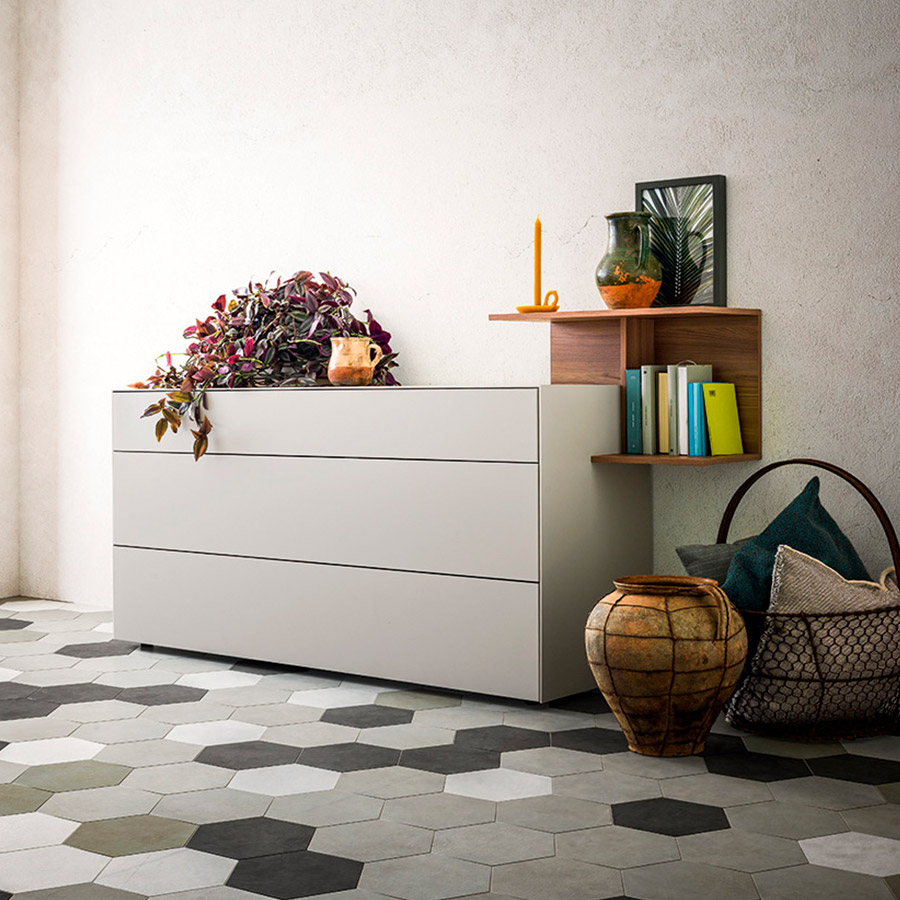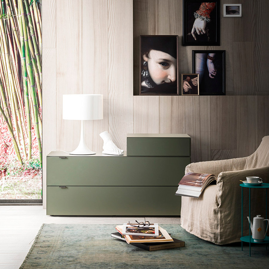 Está disponible con dos versiones de pata y puede montarse suspendido de la pared, ofreciendo amplias posibilidades de composición. También se caracteriza por sus opciones de apertura: un pequeño tirador de metal en posición asimétrica o push-pull.