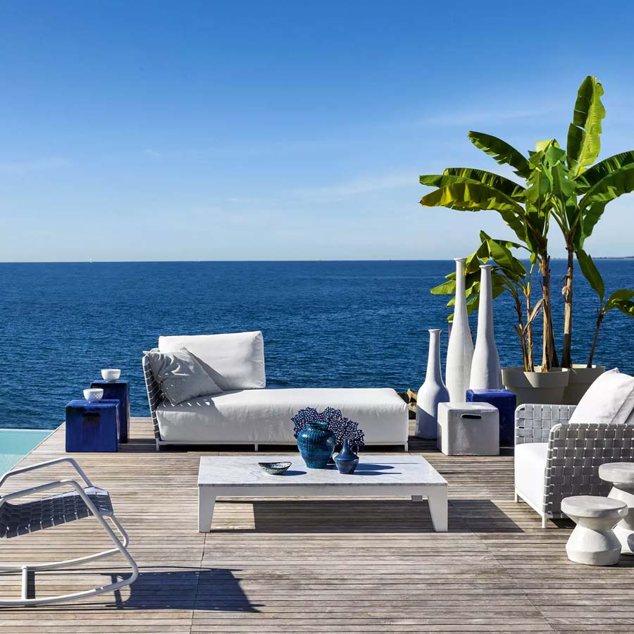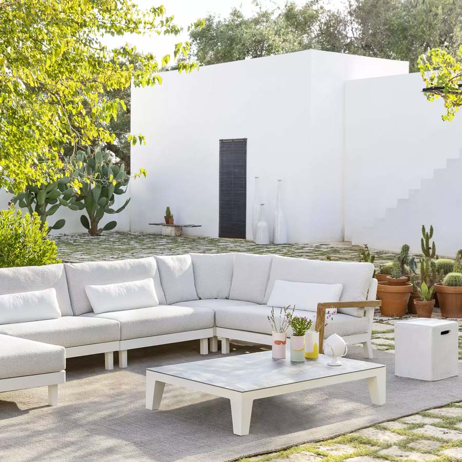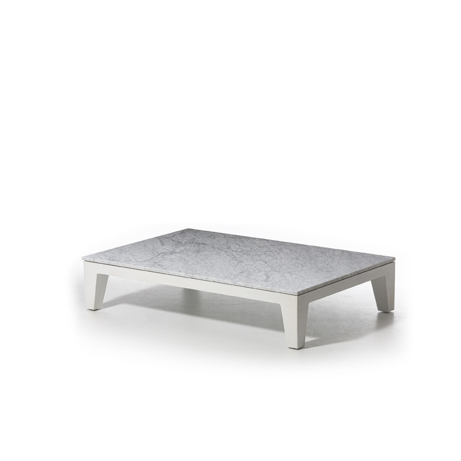 Mesa de centro rectangular, la Inout 155 nace de la combinación de diferentes materiales: formada por una estructura de aluminio pintado de blanco mate, gris o salvia, tiene el tablero disponible en diferentes acabados: con duelas de teca natural, de mármol blanco de Carrara o de gres porcelánico gris, dando origen a un producto de extremada versatilidad.