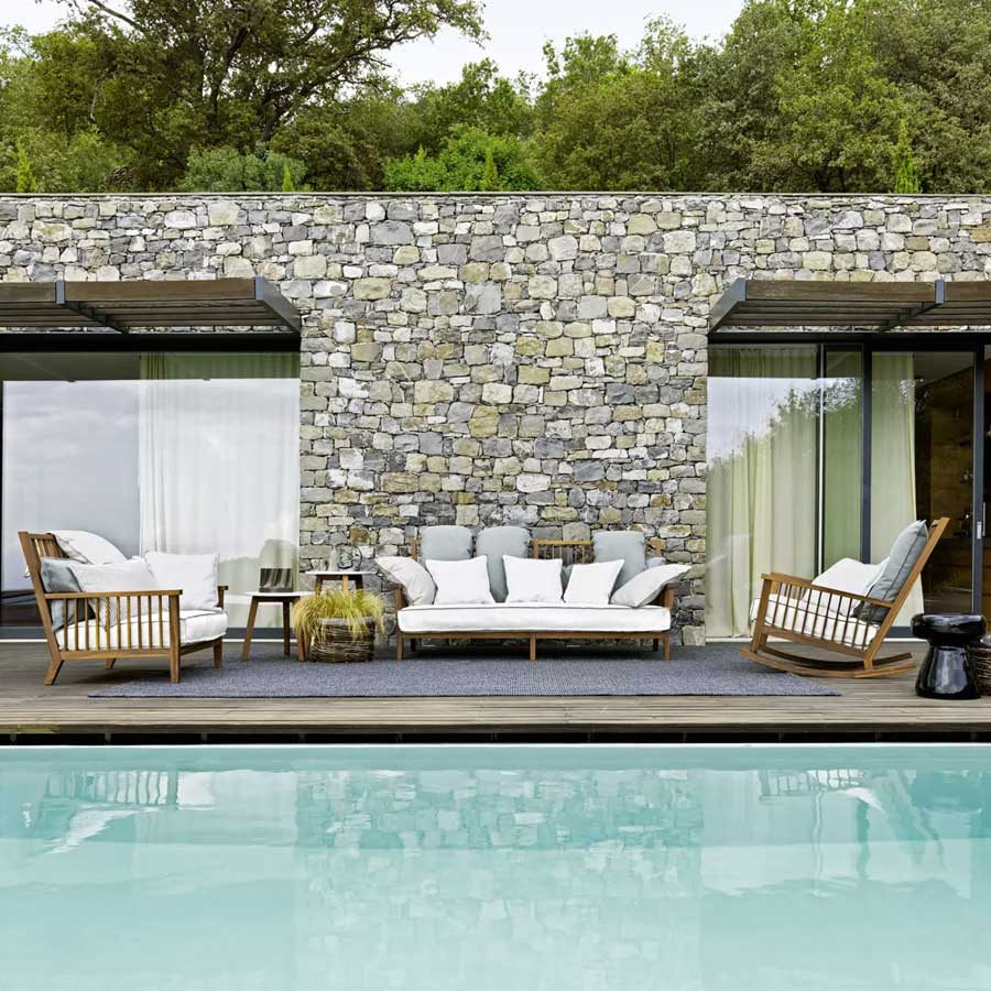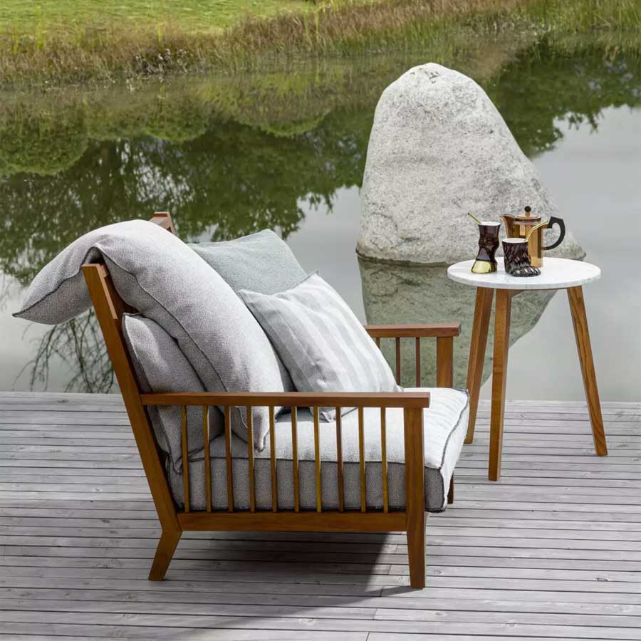 Sillón envolvente y confortable, el Inout 701 tiene una estructura de duelas: está realizado en Iroko aceitada, madera particularmente duradera, por ser naturalmente resistente al agua y a la humedad. El contraste entre la solidez de los amplios listones y la suavidad de los cojines sueltos desenfundables de poliuretano expandido repelente al agua, otorga carácter a este accesorio de decoración.