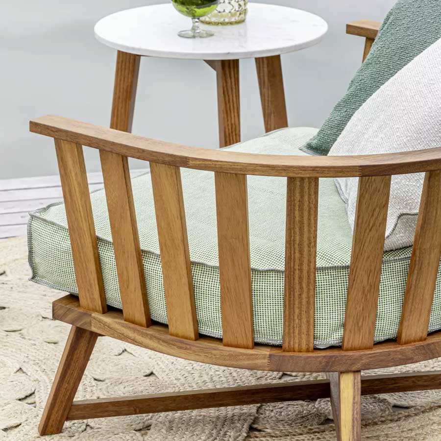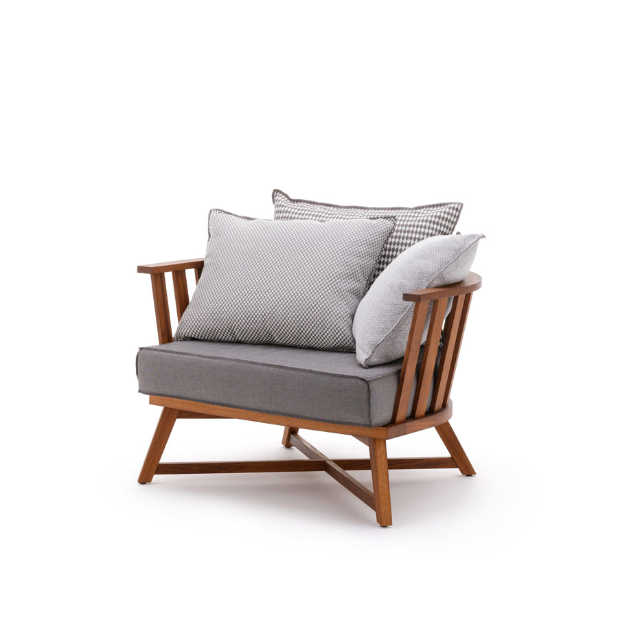Sillón envolvente y confortable, el Inout 707 tiene una estructura de semicírculo con duelas, con patas que se intersecan formando una cruz: está realizado en Iroko aceitada, madera particularmente duradera, por ser naturalmente resistente al agua y a la humedad. El contraste entre la solidez de los amplios listones y la suavidad de los cojines sueltos desenfundables de poliuretano expandido repelente al agua, otorga carácter a este accesorio de decoración.