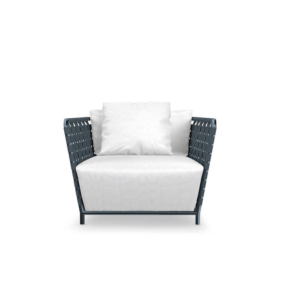 Sillón con amplio asiento y altos brazos, el Inout 801 se desarrolla en torno a una ligera estructura tubular de aluminio pintado de blanco, gris o salvia, material ecológico y único por sus cualidades técnicas. A esto se agrega un particular entramado de cintas elásticas de color gris, negro o azul, un producto innovador a base de goma sintética y propileno. Finalmente, gruesos cojines de asiento y sueltos de poliuretano expandido con fundas extraíbles aumentan el confort del producto.