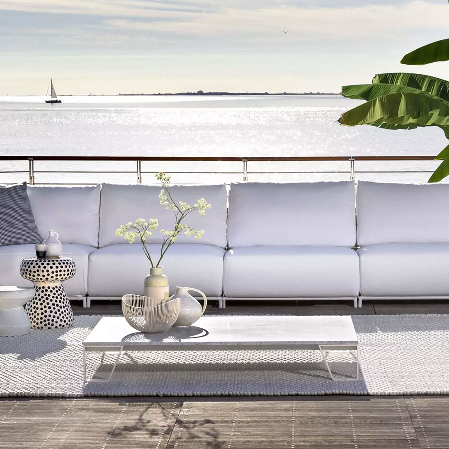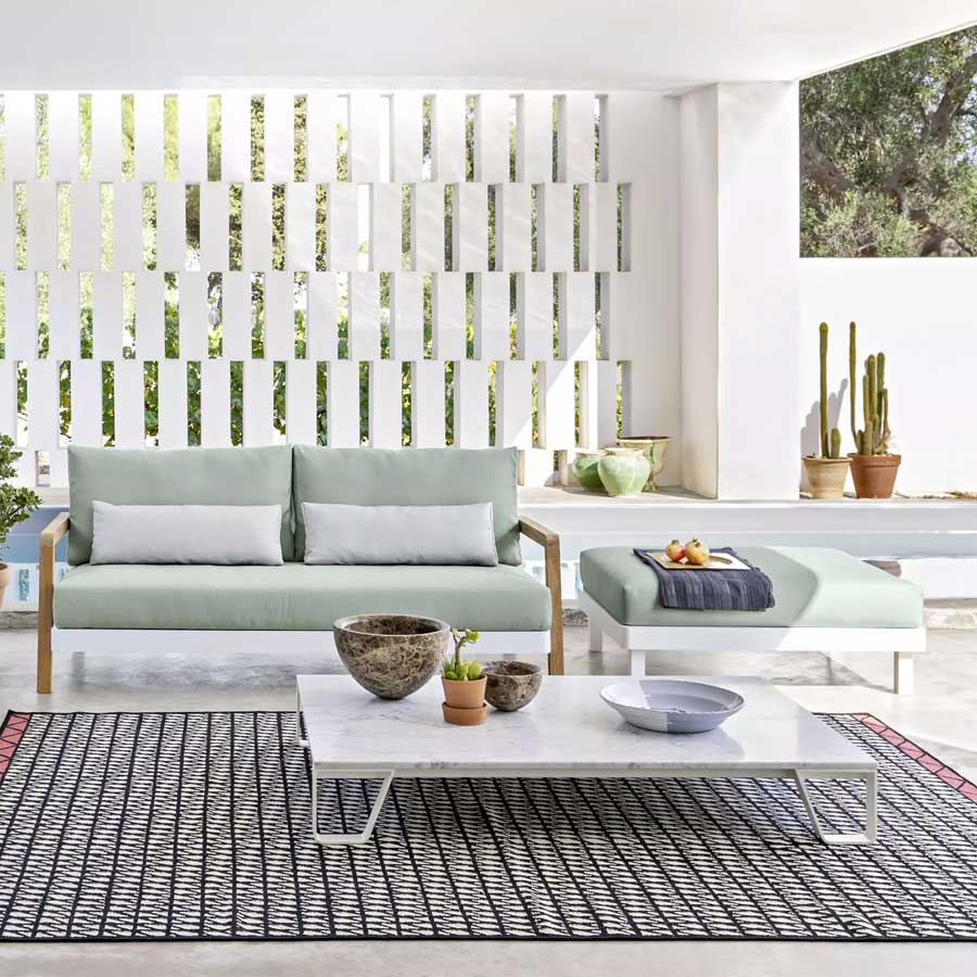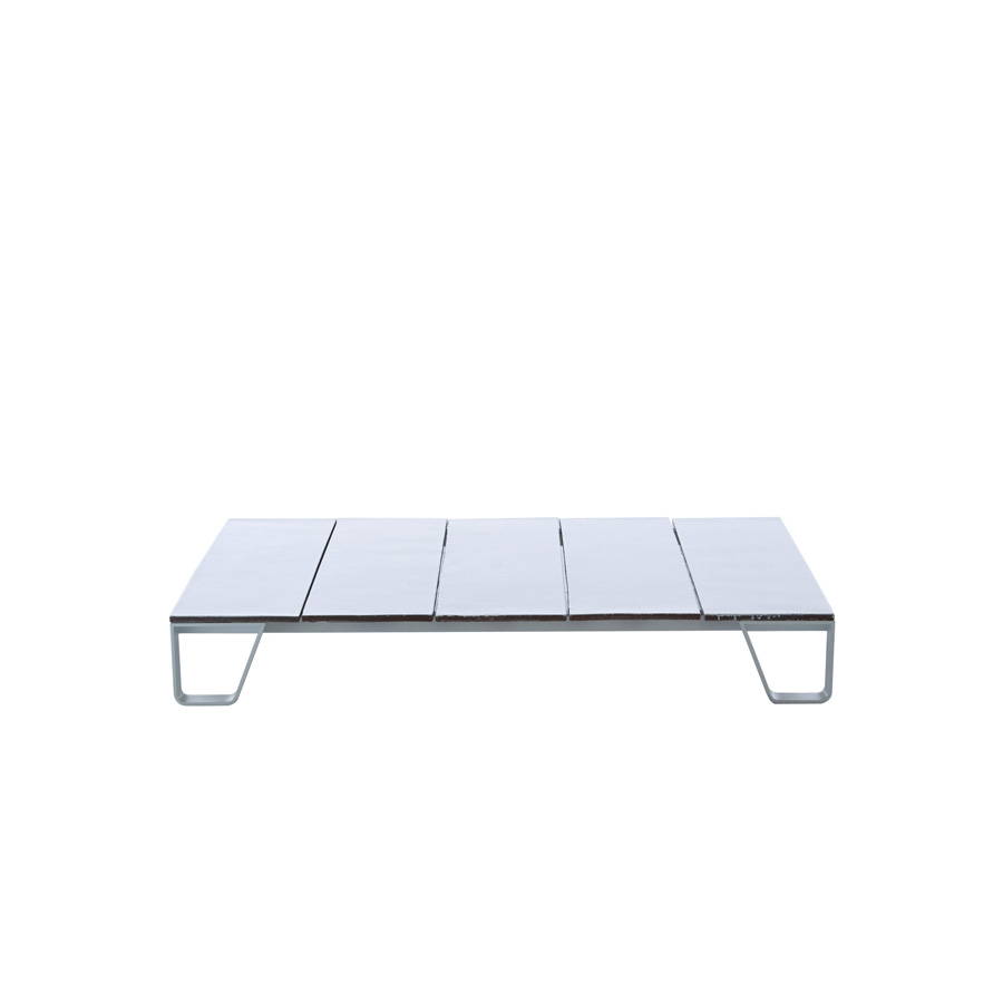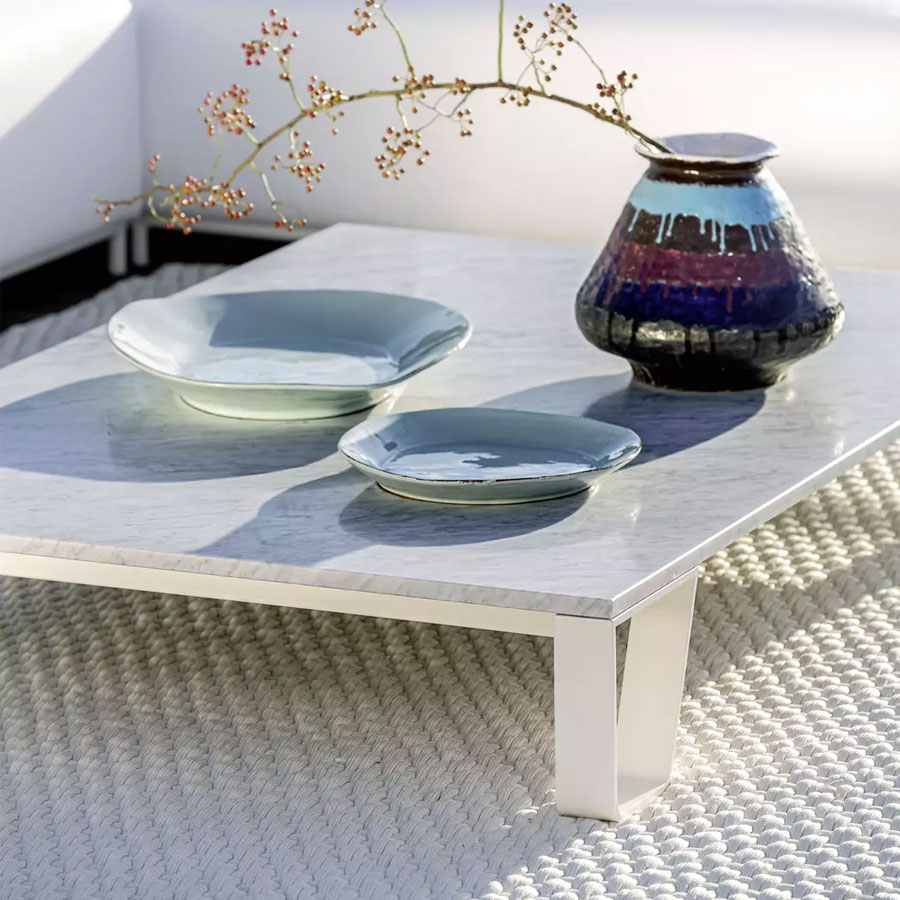 Mesa de centro con tablero rectangular, la Inout 955 expresa una refinada esencialidad nórdica. Mesa de cuatro patas, tiene la estructura y las patas de acero pintado de blanco mate, gris o salvia, que, al estar plegado, dibuja las patas creando un juego visual de llenos y vacíos. El tablero está disponible en duelas de teca, mármol blanco de Carrara, gres porcelánico gris o placas de piedra volcánica esmaltada en blanco o turquesa.