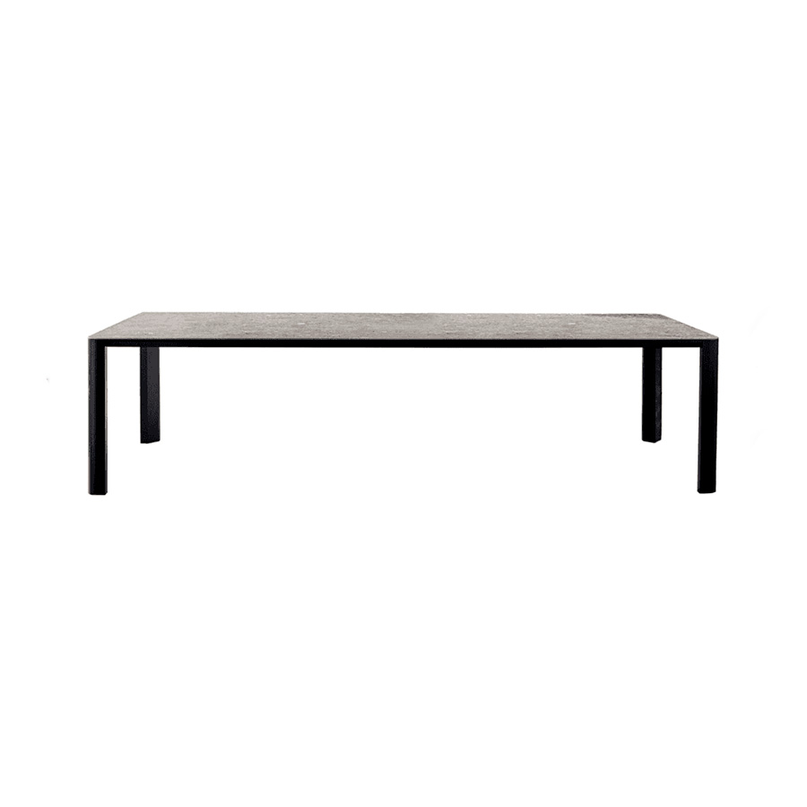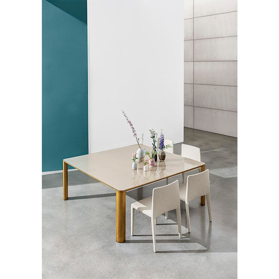 Mesa de comedor con estructura y patas de aluminio, varios acabados. Encimera disponible en diferentes medidas, materiales y varios acabados. Previa solicitud, con acabados específicos, es posible personalizar el modelo para uso al aire libre.