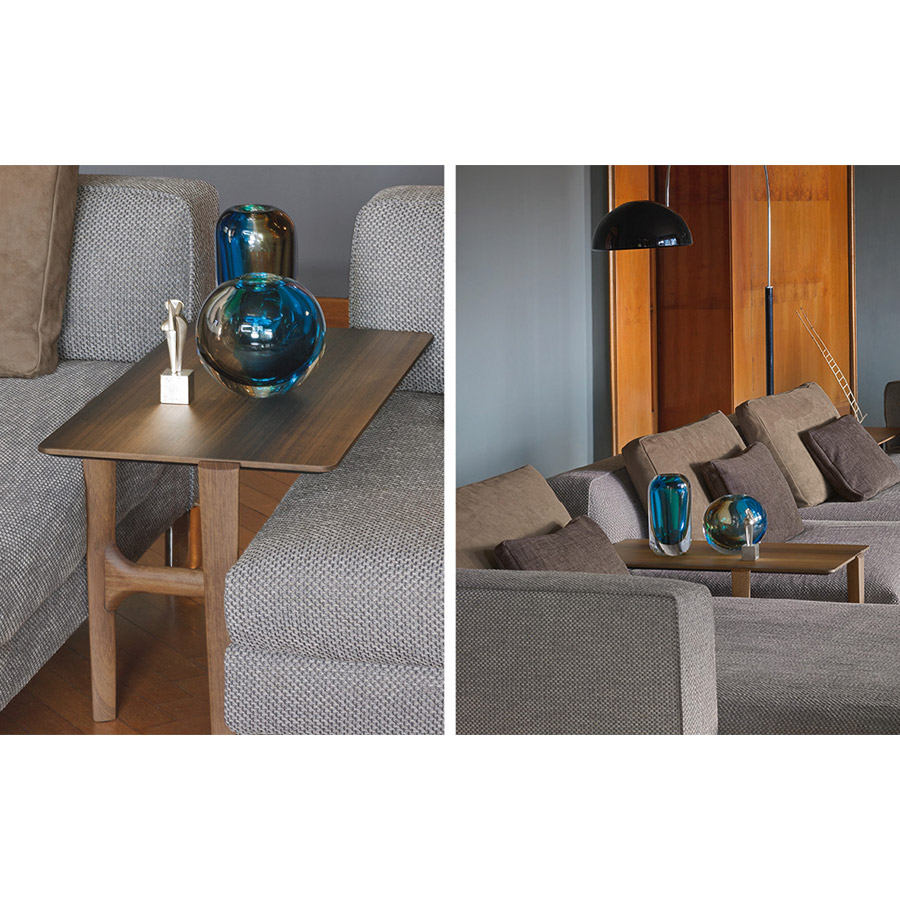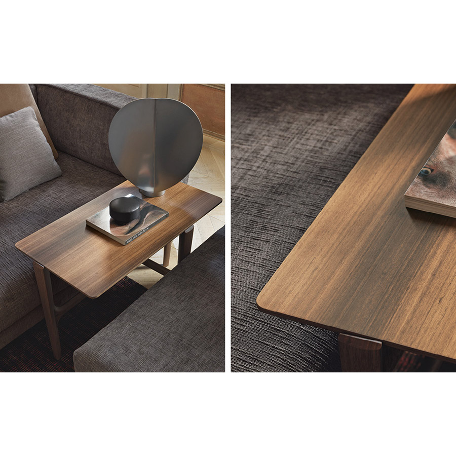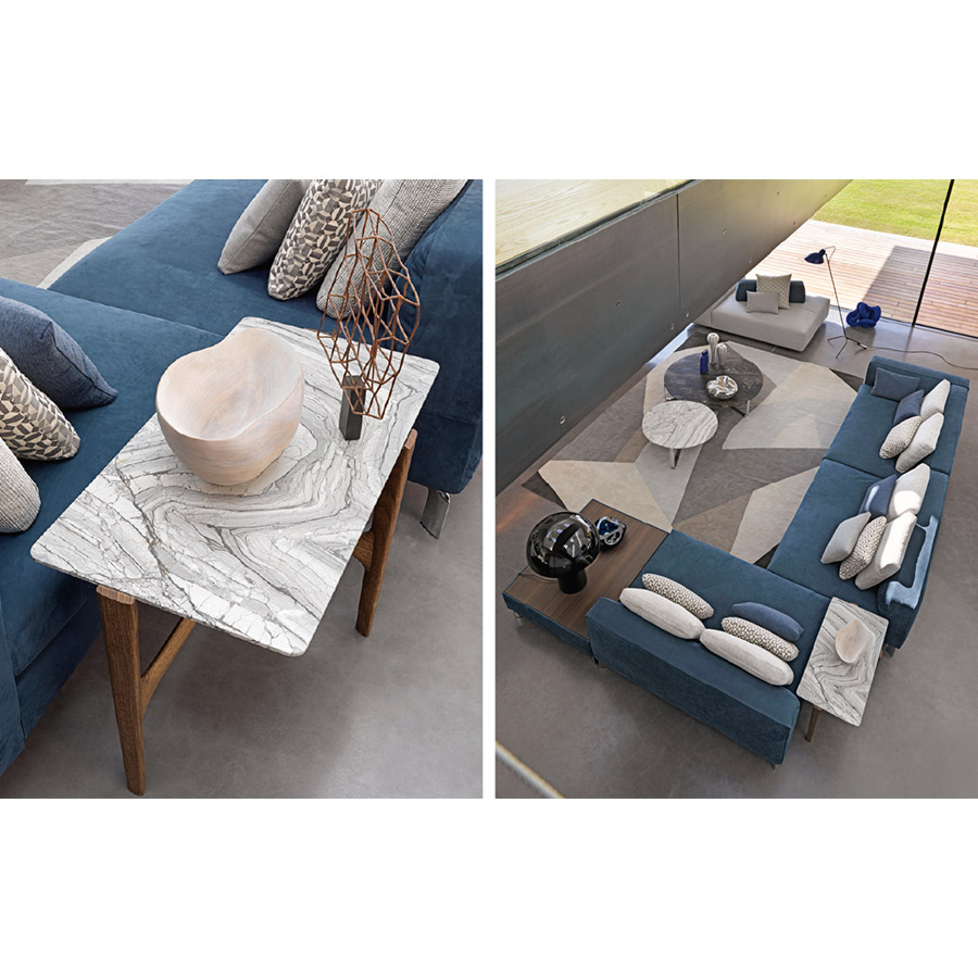 Mesitas con estructura en madera maciza de eucalipto pulido opaco. Top de 20 mm biselado en los bordes, disponible en madera de eucalipto pulido opaco o mármol.
