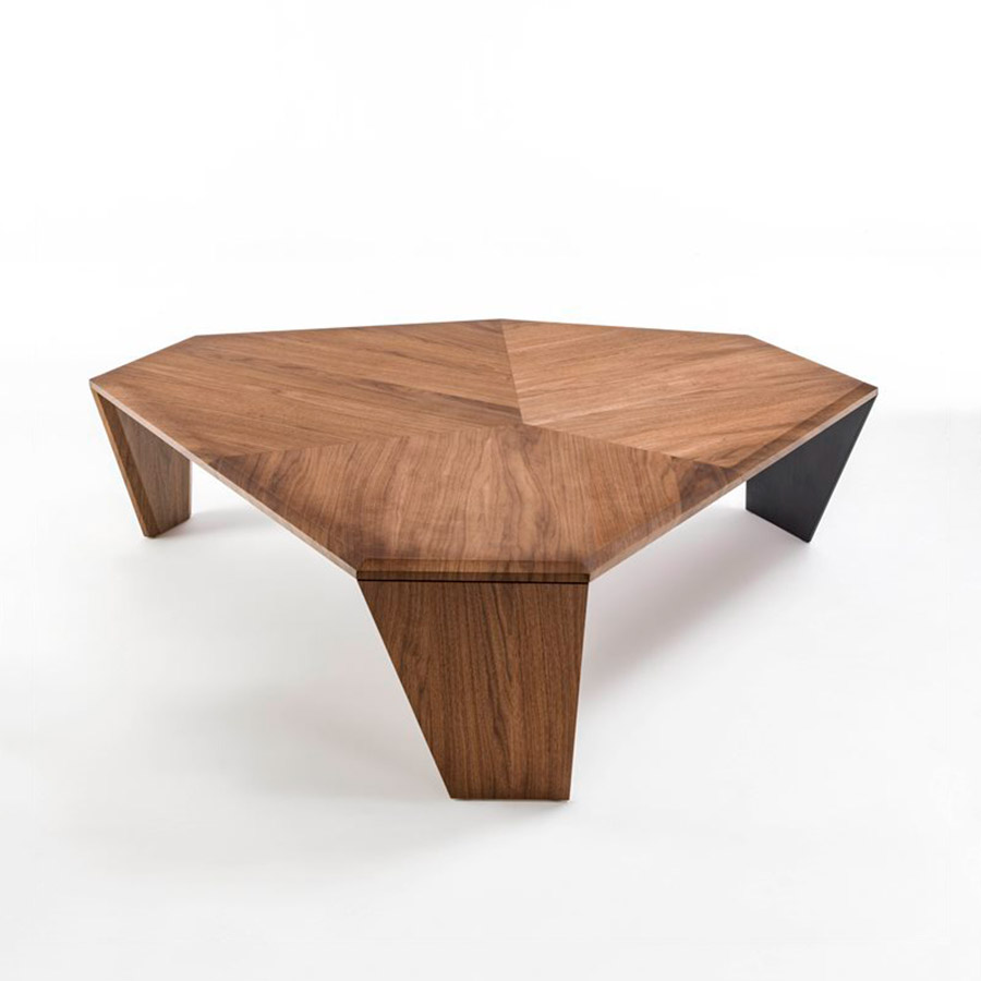 Mesa de centro en nogal canaletta con chapa taraceada, dos patas de madera y una de metal en acabado negro mate. Disponible en dos medidas – 147x134x41 – 108x102x35,5 – Tortuga nace de una idea completamente diferente a la típica mesa de centro. Esta mesa sin duda capta las miradas, integrándose perfectamente en los ambientes más exigentes, cumpliendo todas las expectativas.