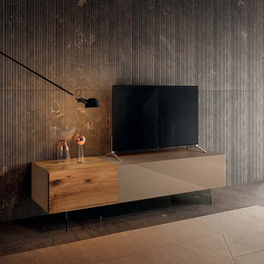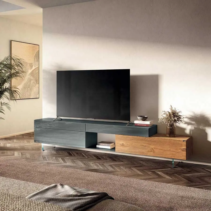 El mueble TV 36e8, disponible como un único volumen o en composiciones más articuladas, se distingue por su modularidad, ofreciendo máxima libertad expresiva en función de las necesidades. Suspendido o apoyado sobre el suelo, resuelve cualquier exigencia en términos de funcionalidades y tamaños, garantizando además altos estándares de calidad. La construcción a 45º con junta en aluminio y la excepcional selección de materiales aseguran un producto extremadamente resistente a lo largo del tiempo.