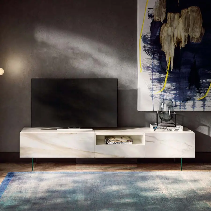 Elegante mueble TV en mármol XGlass Calacatta Gold, suspendido sobre elegantes soportes en cristal, para amueblar tu salón con un estilo único.