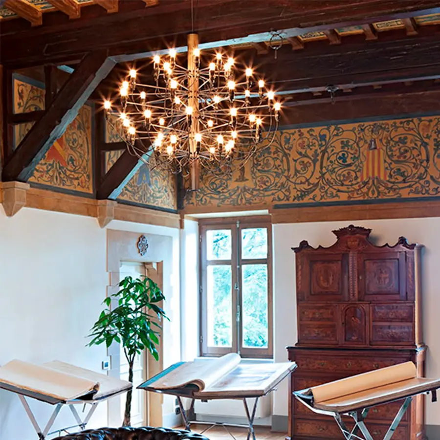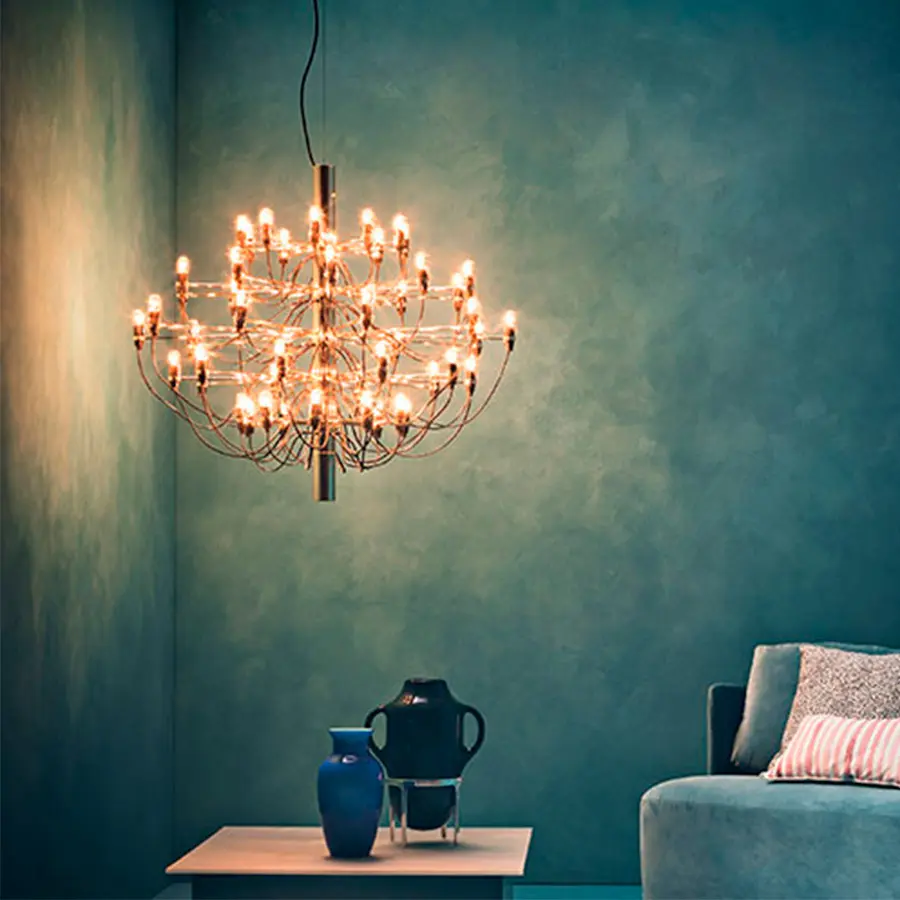 Lámpara de suspensión de luz difusa. Estructura central en hierro y brazos en latón, ambos cromados o dorados. Base de conexión a techo y florón en acero. Su perfil llamativo está disponible en latón, cromo o negro mate y en tres tamaños; pequeño con 18 bombillas, mediano con 30 bombillas y grande con 50 bombillas. Ideal para colocarla sobre la mesa de comedor, iluminando un hall de entrada o dentro de una sala de estar.