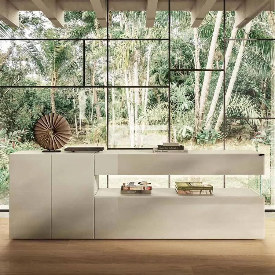 Gracias a la modularidad del sistema 36e8 nacen originales aparadores personalizables en tamaño, formas y colores, que resuelven cualquier exigencia de almacenaje para cualquier contexto y estilo. Volúmenes monolíticos o desestructurados, suspendidos o apoyados; pueden integrar almacenadores totalmente en cristal y Wall panels haciendo todavía más amplias las posibilidades a la hora de proyectar. La original junta en aluminio con trabajado a 45º, la puerta perfilada y el lacado interior junto a materiales como la madera Wildwood, el cristal tintado o el mármol, metal, madera y tejido XGlass dan fe de la excelencia constructiva de un producto extremadamente duradero.