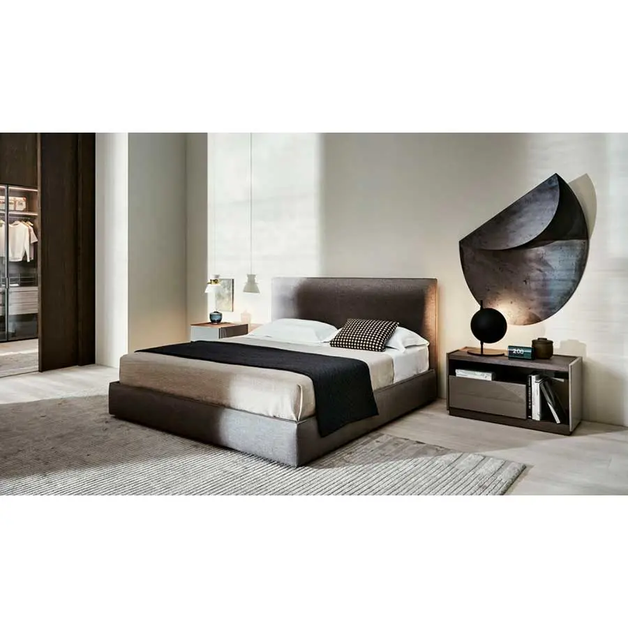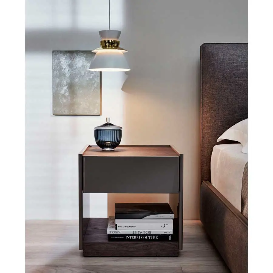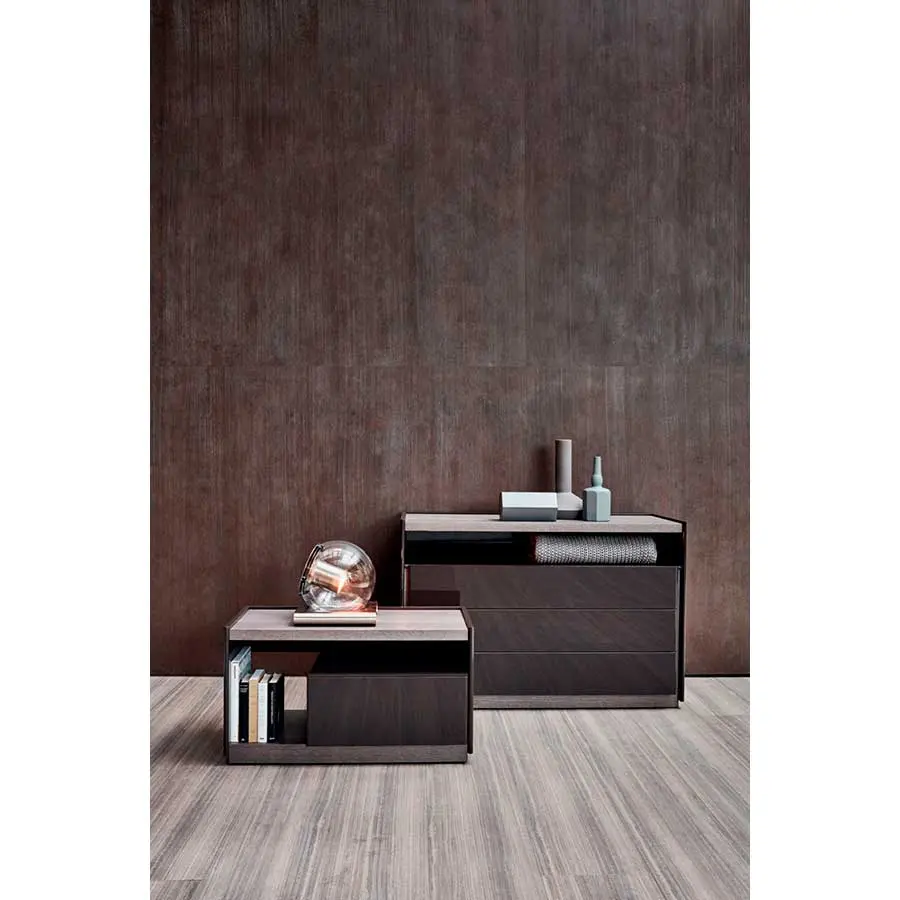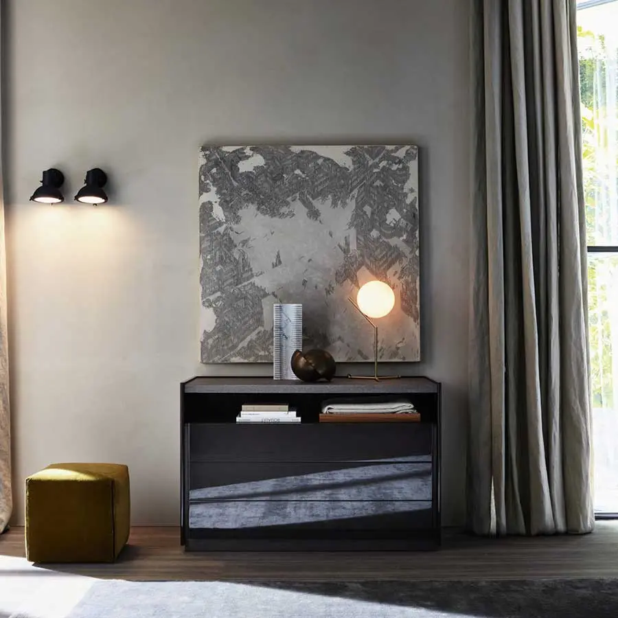 Riqueza de materiales utilizados y un diseño riguroso son los elementos que caracterizan 5050, una colección de complementos de dormitorio diseñada por Rodolfo Dordoni. Superficies en laca brillante o mate se alternan con sobres en madera y bandejas en Eco Skin, plasmando una agradable alternancia cromática que destaca el juego entre partes abiertas y cerradas de un proyecto geométrico nunca banal. Interesante el perfil redondeado de los elementos estructurales que componen mesillas y cajoneras.