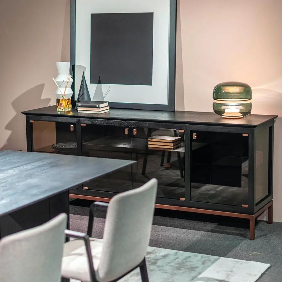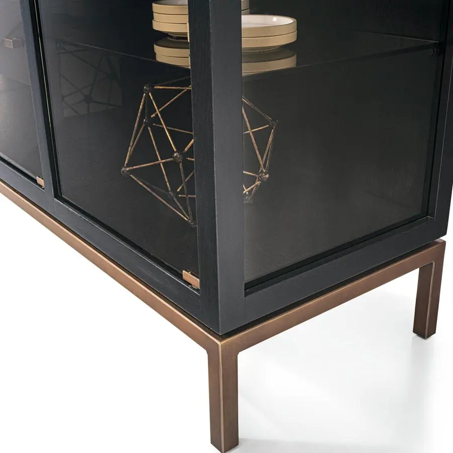 Vitrina baja con estructura de madera maciza caracterizada por puertas, laterales y baldas interiores de cristal. Fijar balda intermedia en madera. Disponible con 2 o 4 puertas de vidrio, con cajones internos o externos y base de hierro. Innovador sistema LED con focos, con activación independiente y carga inalámbrica.