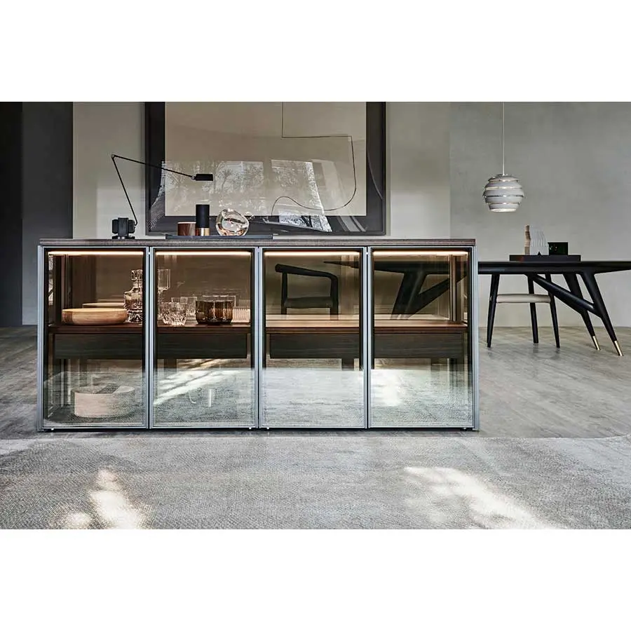 En Adrien se reduce al mínimo el espesor estructural del aluminio, dejando que el Cristal Stopsol y el sistema de iluminación LED incorporado a los estantes, valoricen al máximo los objetos que se exponen. Configuración de cuatro o cinco puertas, con una sóla altura. La trasera puede ser en madera, Fine Grain o cristal, aportando al objeto una transparencia completa. Puerta realizada sólo en Cristal Stopsol y abierta gracias a una nueva bisagra patentada de 95°.