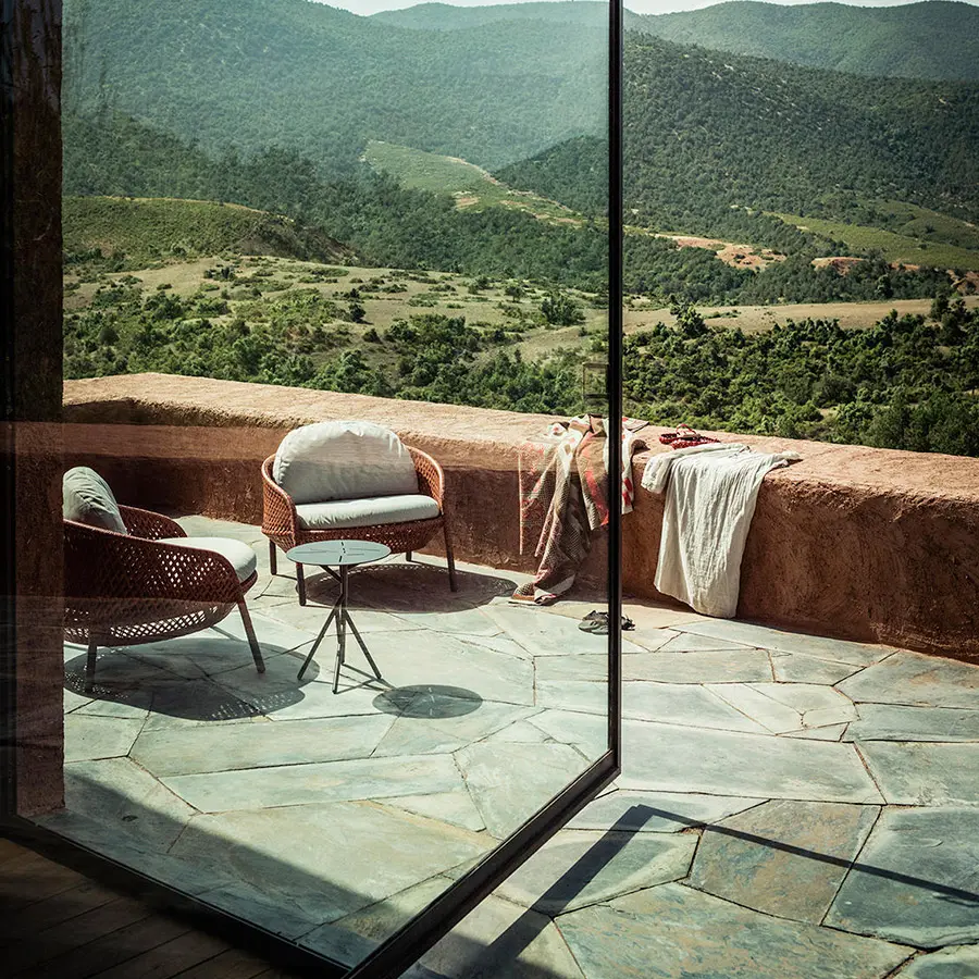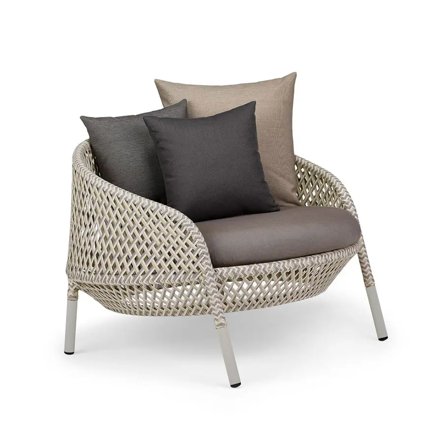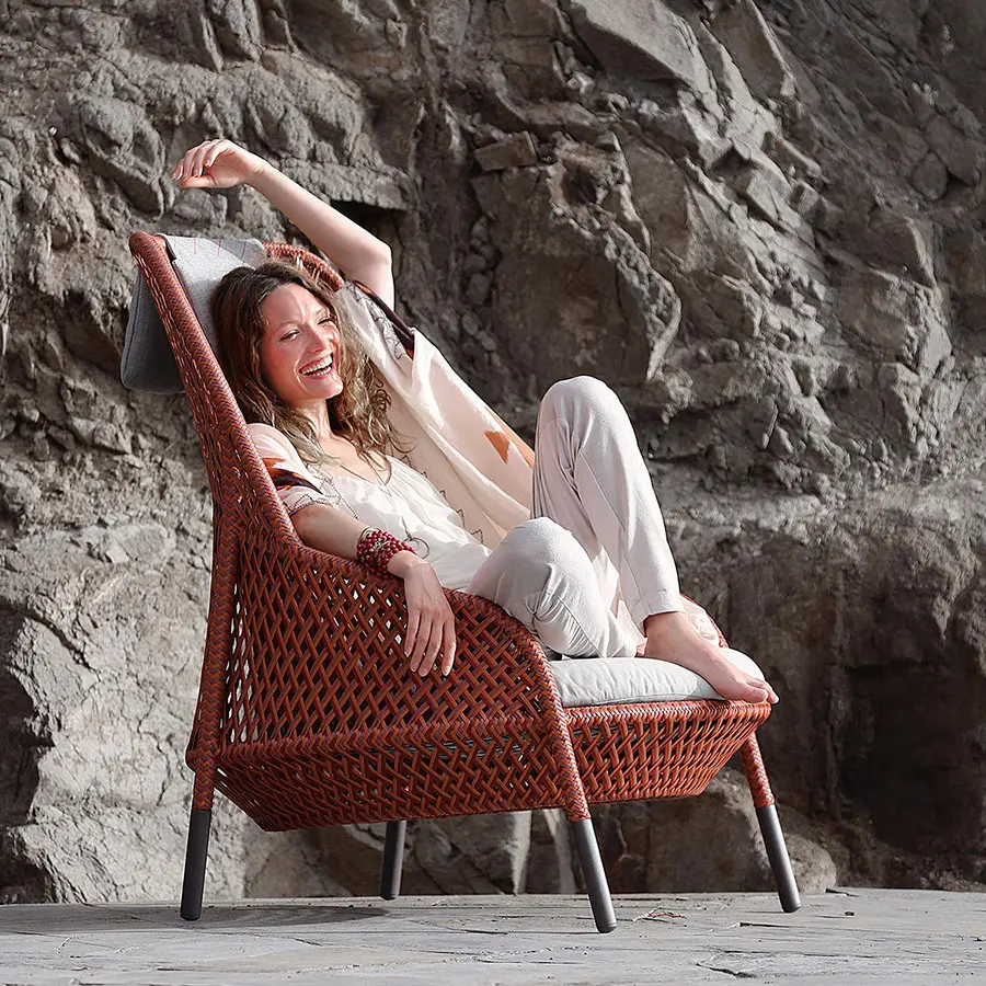 AHNDA nos atrapa de inmediato por su apariencia, que refleja el esfuerzo del diseñador por sumergirse en la rica cultura de los tejedores de Filipinas para desarrollar el característico trenzado abierto de esta silla. Creada con fibra DEDON resistente al agua, esta “estructura transparente” transmite una sensación de refrescante ligereza, mientras que el chásis de ANDHA, que se puede observar claramente desde abajo, supone un nuevo enfoque en el diseño clásico de los loungers.