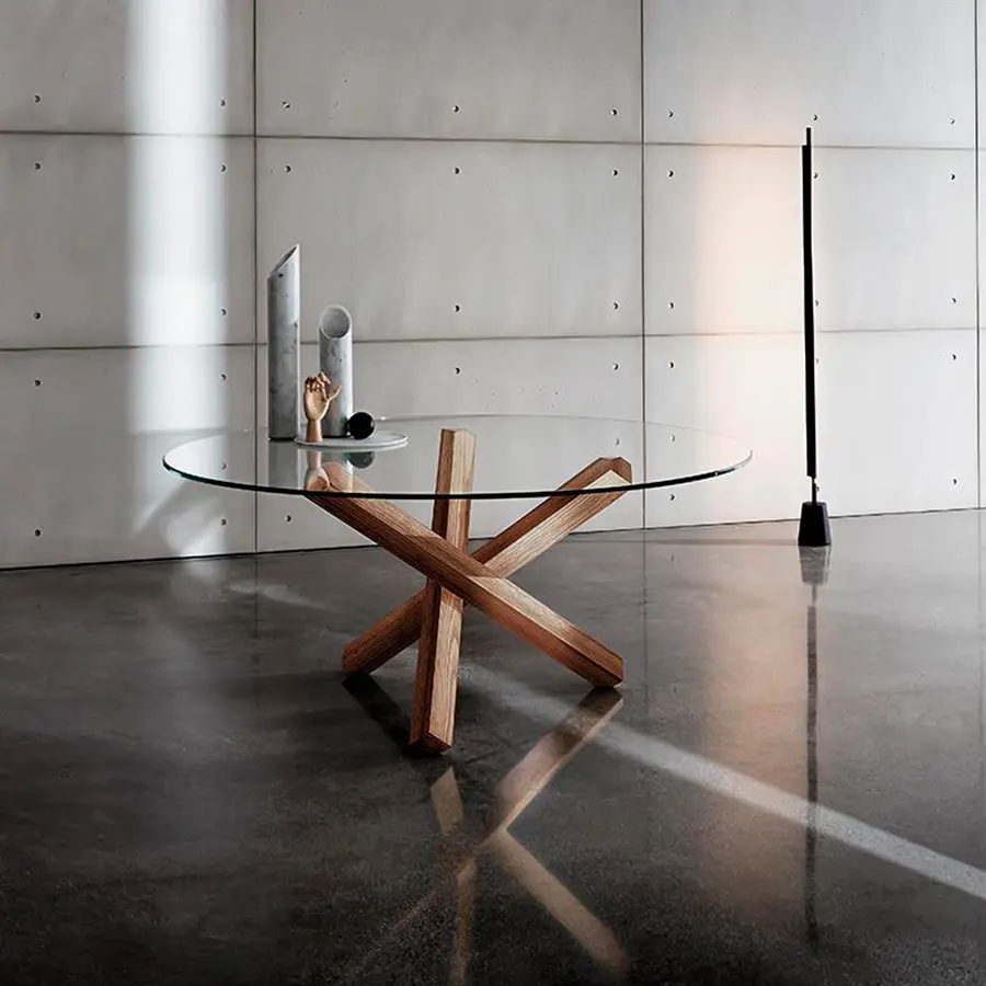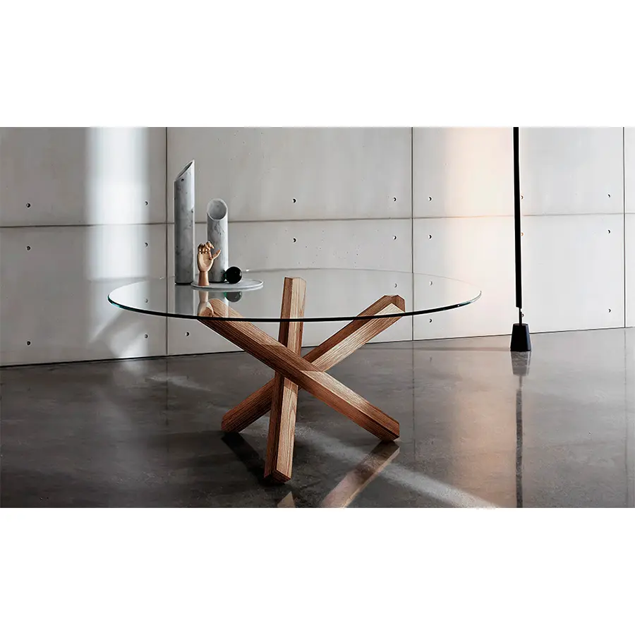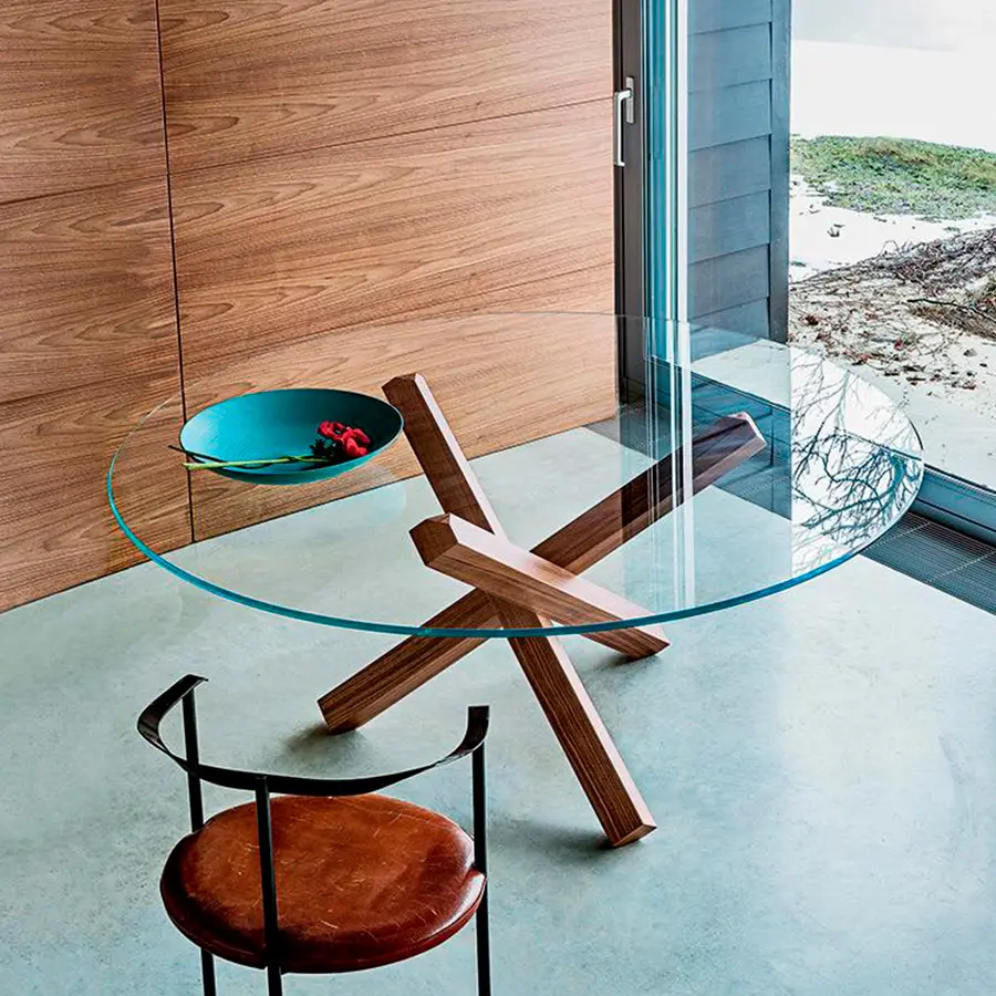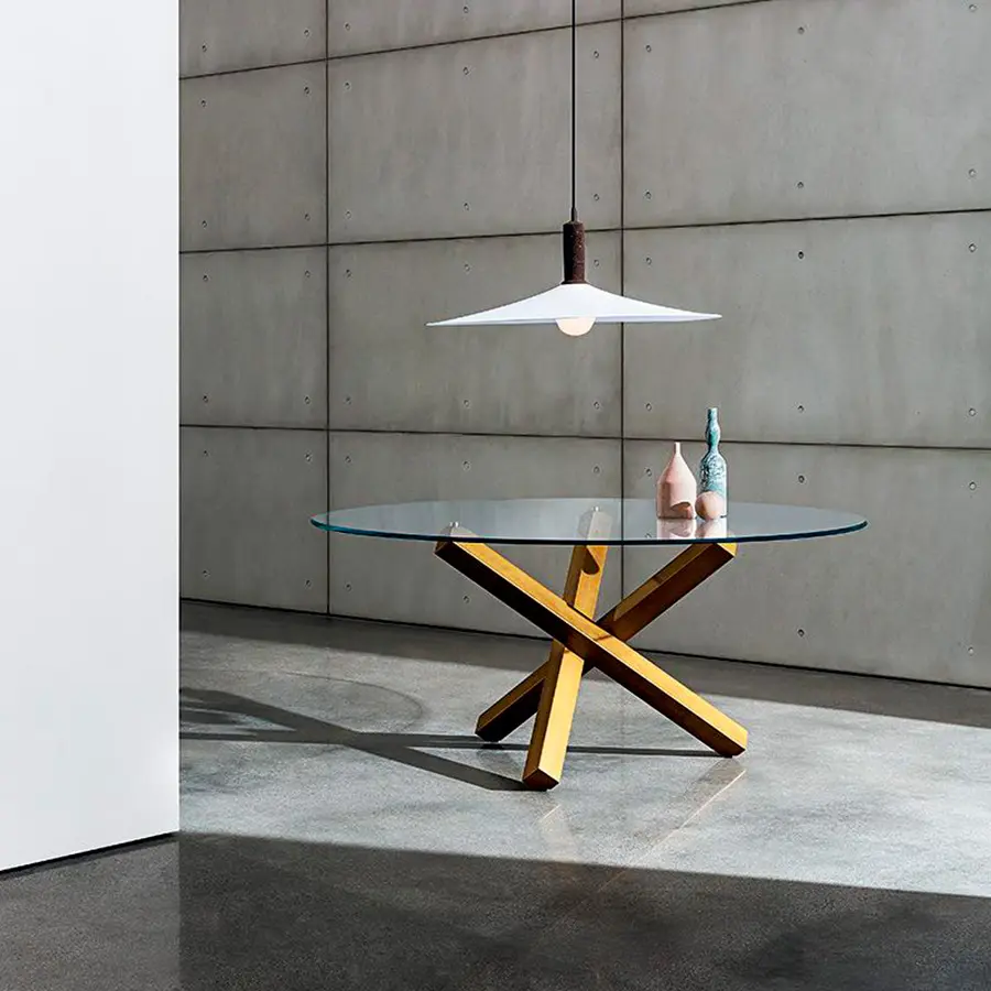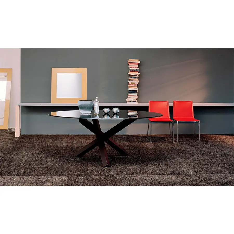 Aikido es una mesa de comedor con un diseño escultórico que se convierte en protagonista de la vida cotidiana gracias a sus materiales cálidos y prestigiosos. La base soporta la tapa redonda, ovalada o cuadrada, mientras que la versión con base doble y tapa rectangular es la solución ideal para grandes espacios domésticos o salas de reuniones.