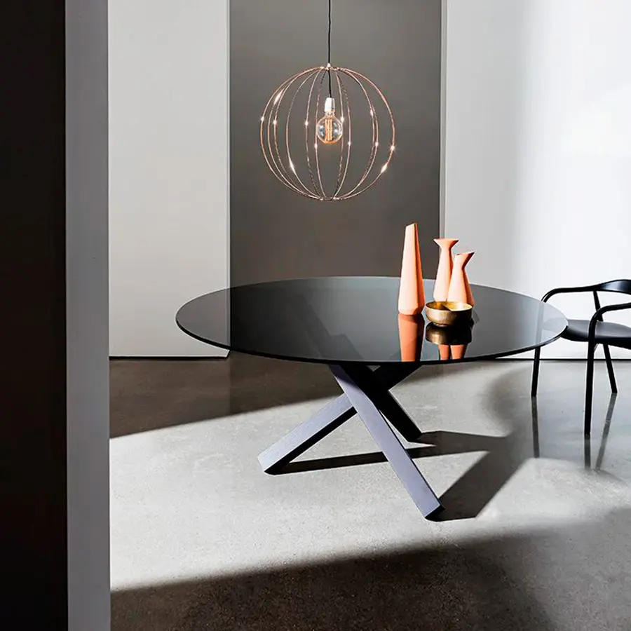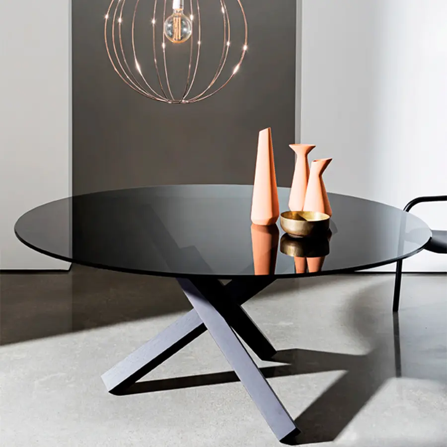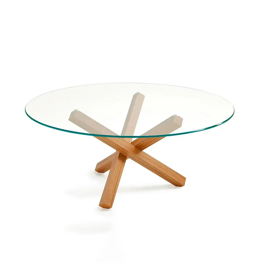La mesa está disponible con base en madera: varios acabados, o en metal: cromo brillo, lacado o latón. Tapa templada o laminada en diferentes medidas, materiales y acabados.