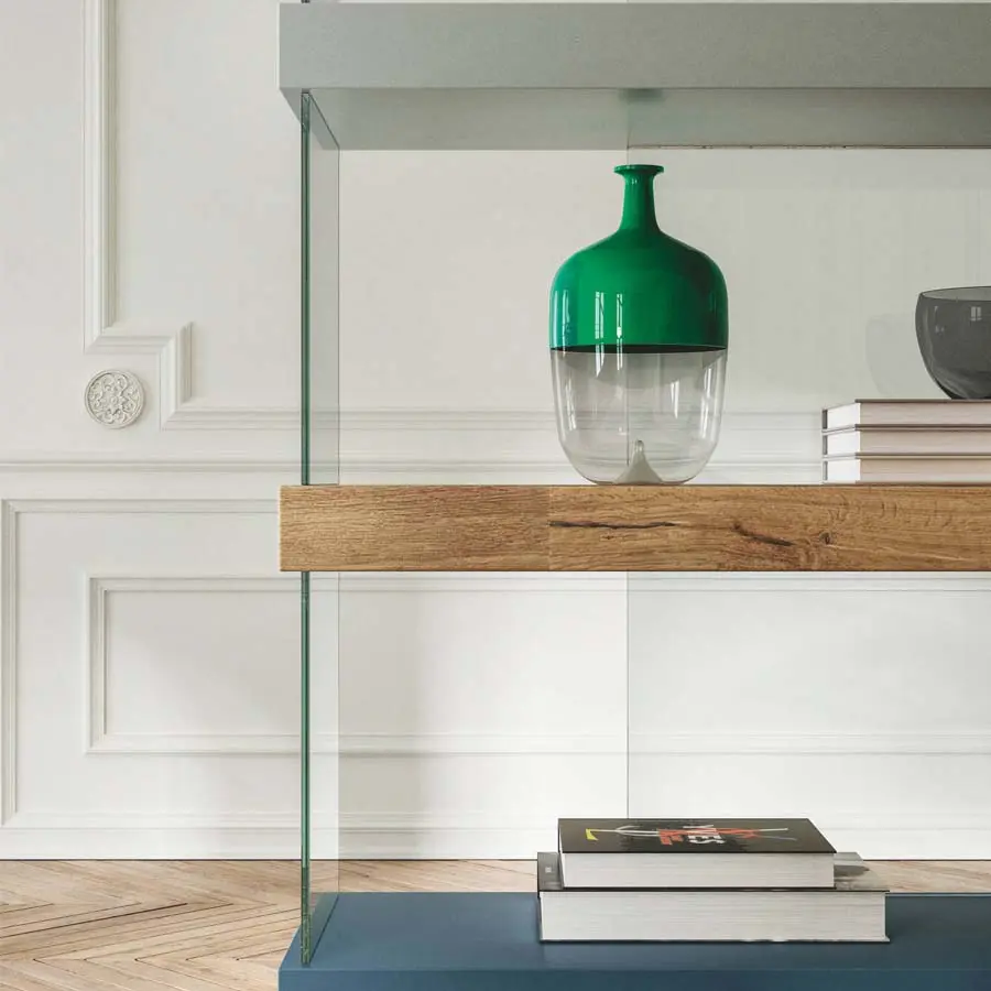 Una relectura del espacio que cambia la relación entre lleno y vacío. La librería Air suspendida sobre apoyos en cristal parece flotar en el aire, dejando pasar la luz y regalando una sensación de extrema ligereza al ambiente. Los estantes y los almacenadores están fijados al cristal mediante un trabajado a encaje, que garantiza máxima seguridad y estabilidad a la estructura. Libre de vínculos dimensionales y posicionable en el centro de la habitación, la librería se integra en la arquitectura existente, convirtiéndose en una pared que subdivide los espacios con armonía.