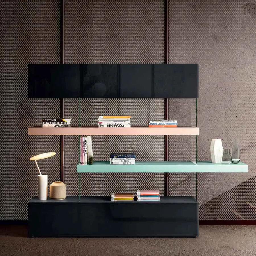 Una relectura del espacio que cambia la relación entre lleno y vacío. La librería Air suspendida sobre apoyos en cristal parece flotar en el aire, dejando pasar la luz y regalando una sensación de extrema ligereza al ambiente. Los estantes y los almacenadores están fijados al cristal mediante un trabajado a encaje, que garantiza máxima seguridad y estabilidad a la estructura. Libre de vínculos dimensionales y posicionable en el centro de la habitación, la librería se integra en la arquitectura existente, convirtiéndose en una pared que subdivide los espacios con armonía.