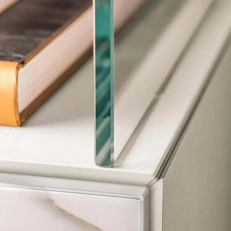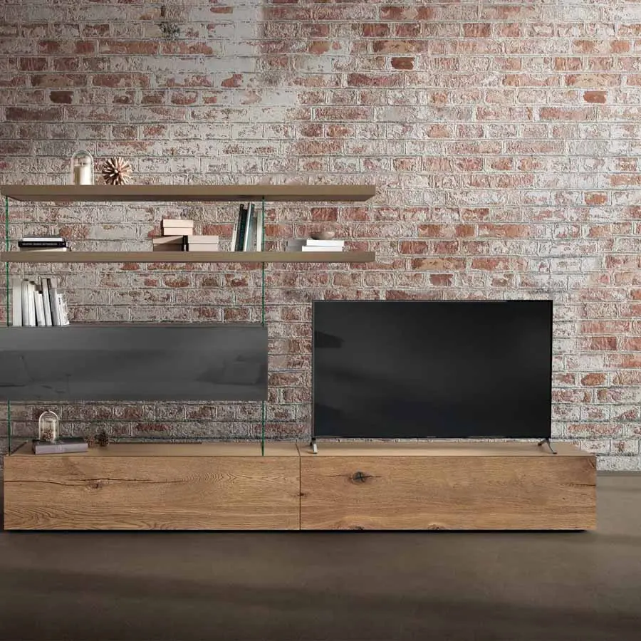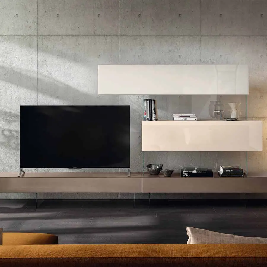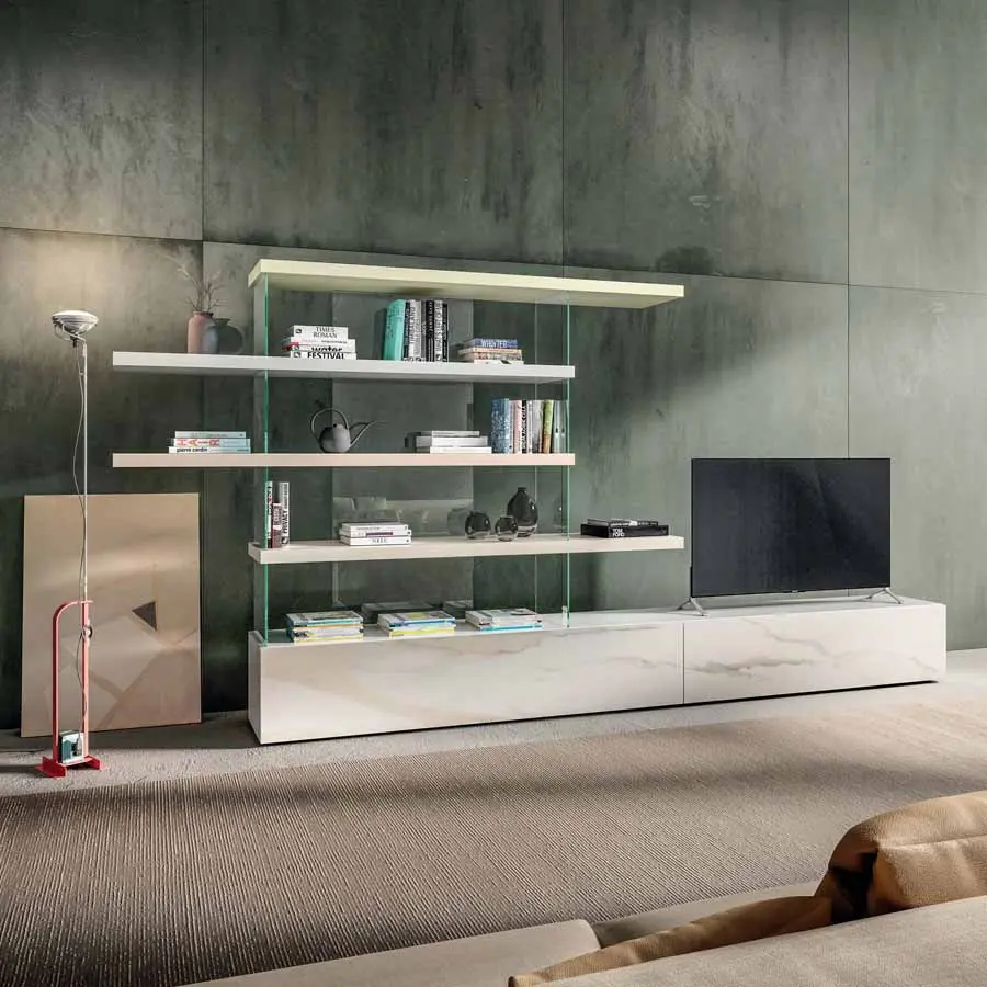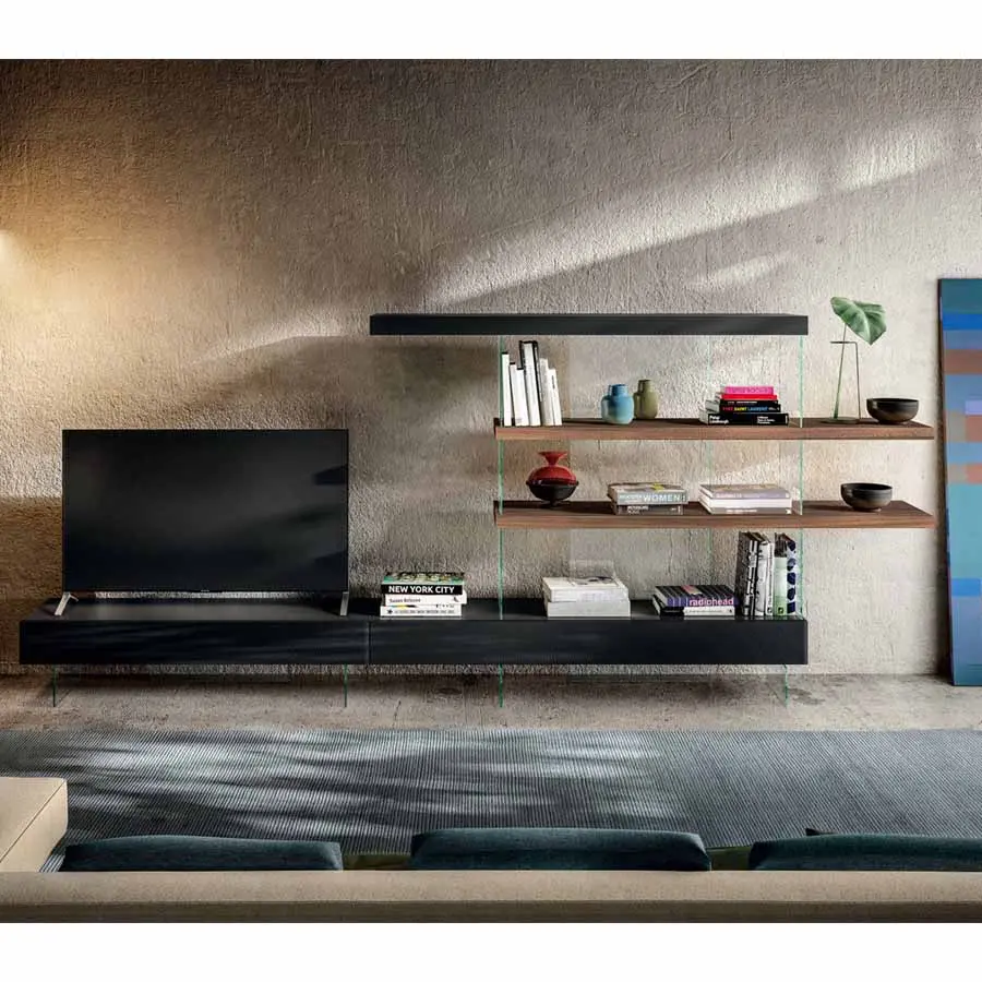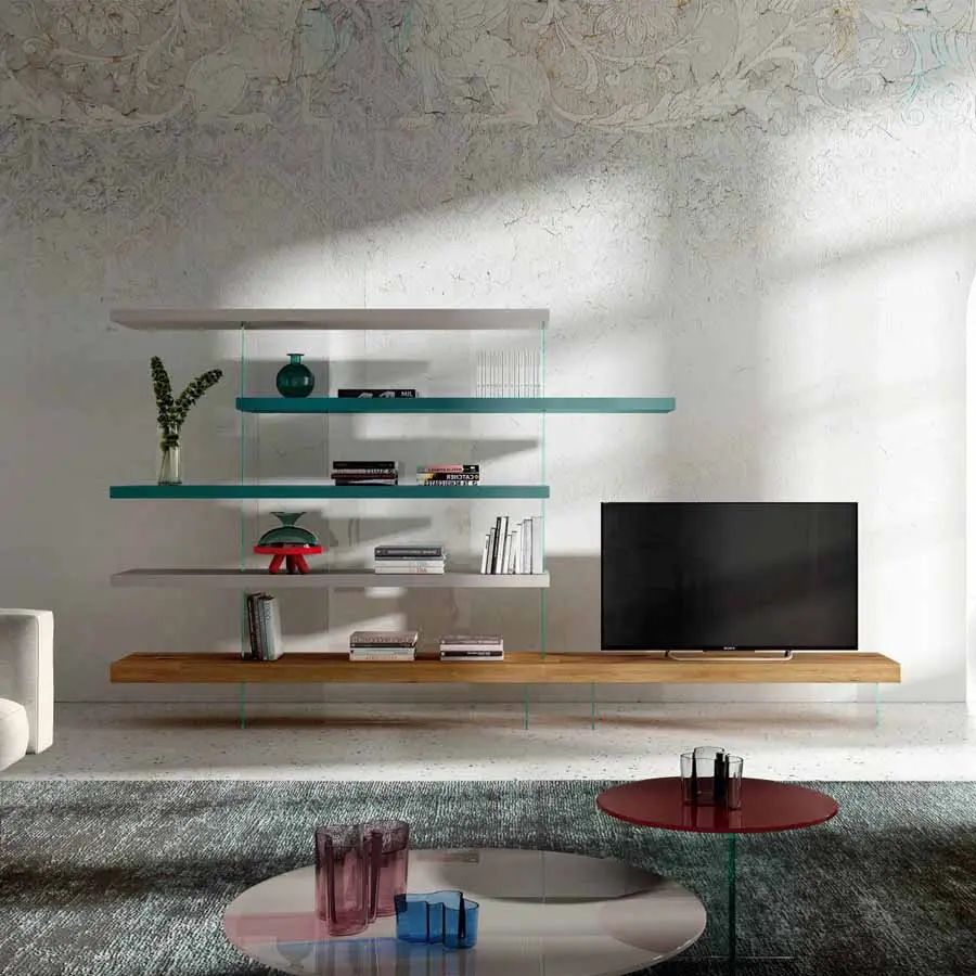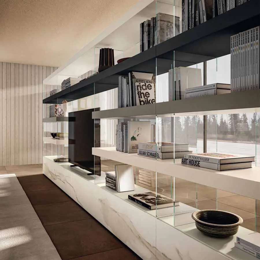 Un juego de contraposiciones, que transmite ligereza y asegura al mismo tiempo extrema resistencia, da vida a la pared equipada Air. La relación entre lleno y vacío se revoluciona gracias a la suspensión de estantes y almacenadores sobre transparentes estructuras en cristal templado. La pared equipada Air, completamente free-standing, es una solución elegante que permite amueblar el salón sin vínculos de anclaje.