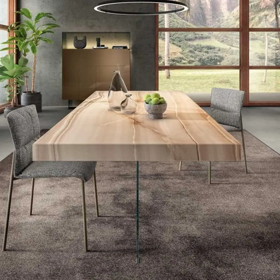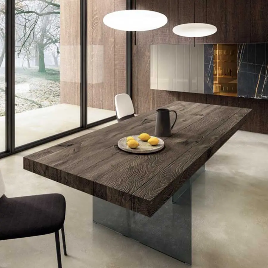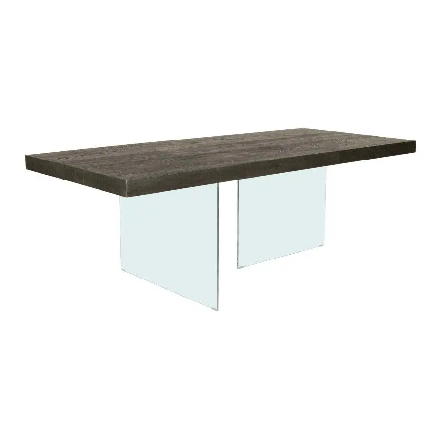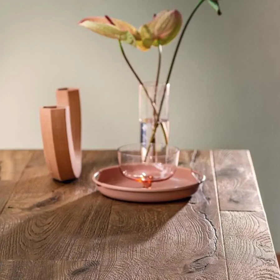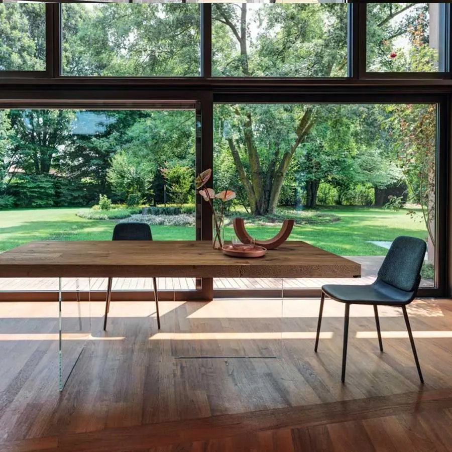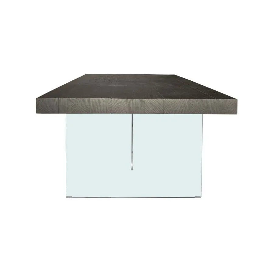 Además de las patas personalizables en cristal extraclaro o fumé, también el tablero está disponible en diferentes acabados: desde la calidez de la madera de roble Wildwood a la elegancia del cristal y del XGlass. La mesa Air surge de la insólita idea de contraponer los volúmenes habituales: dos elegantes soportes, casi invisibles, sostienen un tablero grueso y amplio. Sobria y sorprendente, esta mesa parece flotar en el vacío, gracias a la transparencia de los sólidos soportes en cristal templado, regalando una sensación de gran ligereza a los ambientes.