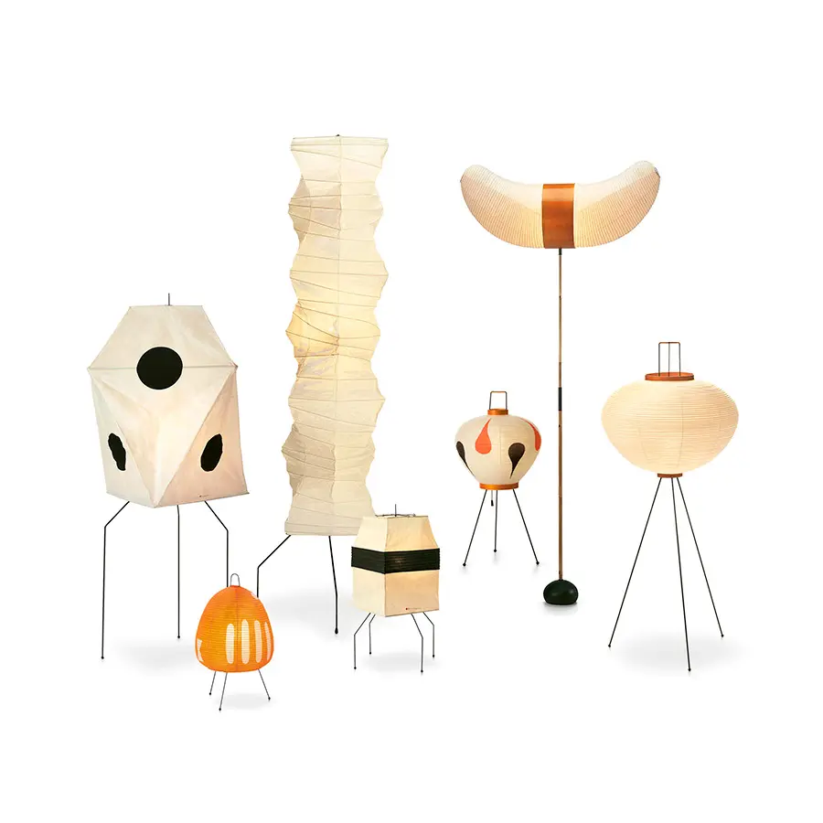 Las Akari Light Sculptures (1951) de Isamu Noguchi son una serie de lámparas hechas a mano por artesanos japoneses con papel washi tradicional. «La crudeza de la luz eléctrica se transforma, gracias a la magia del papel, en la luz de nuestros orígenes: el sol». (Noguchi)