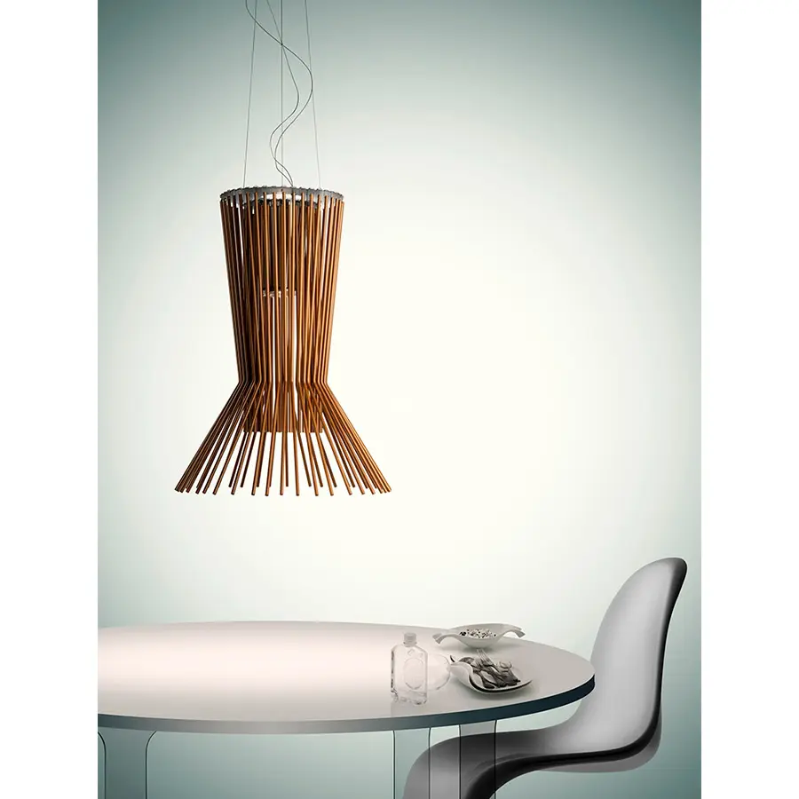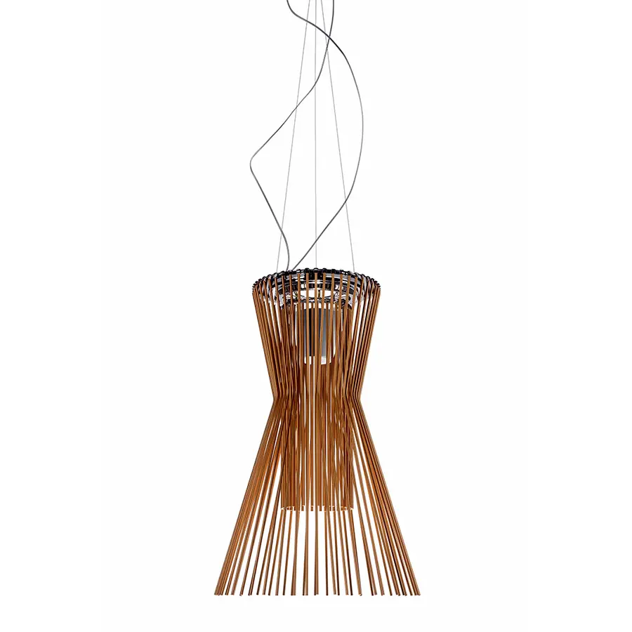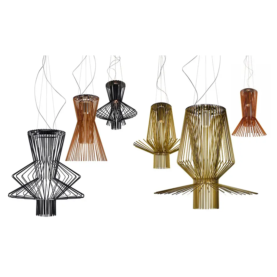 Allegro es una familia de lámparas de suspensión que toman forma gracias a la fuerza de gravedad, realizadas con líneas metálicas que dibujan la luz y emiten sonidos cuando se rozan. El nombre de la colección se inspira precisamente en esta «musicalidad». Tres posibles versiones, según el acabado de los elementos de metal, para expresar tres estilos distintos: Allegro Ritmico en grafito, Allegro Vivace en cobre y Allegro Assai en oro. Su gran tamaño hace que sean adecuadas para resaltar grandes ambientes, tanto públicos como privados, garantizando una iluminación difusa, directa hacia abajo y reflejada en el techo.