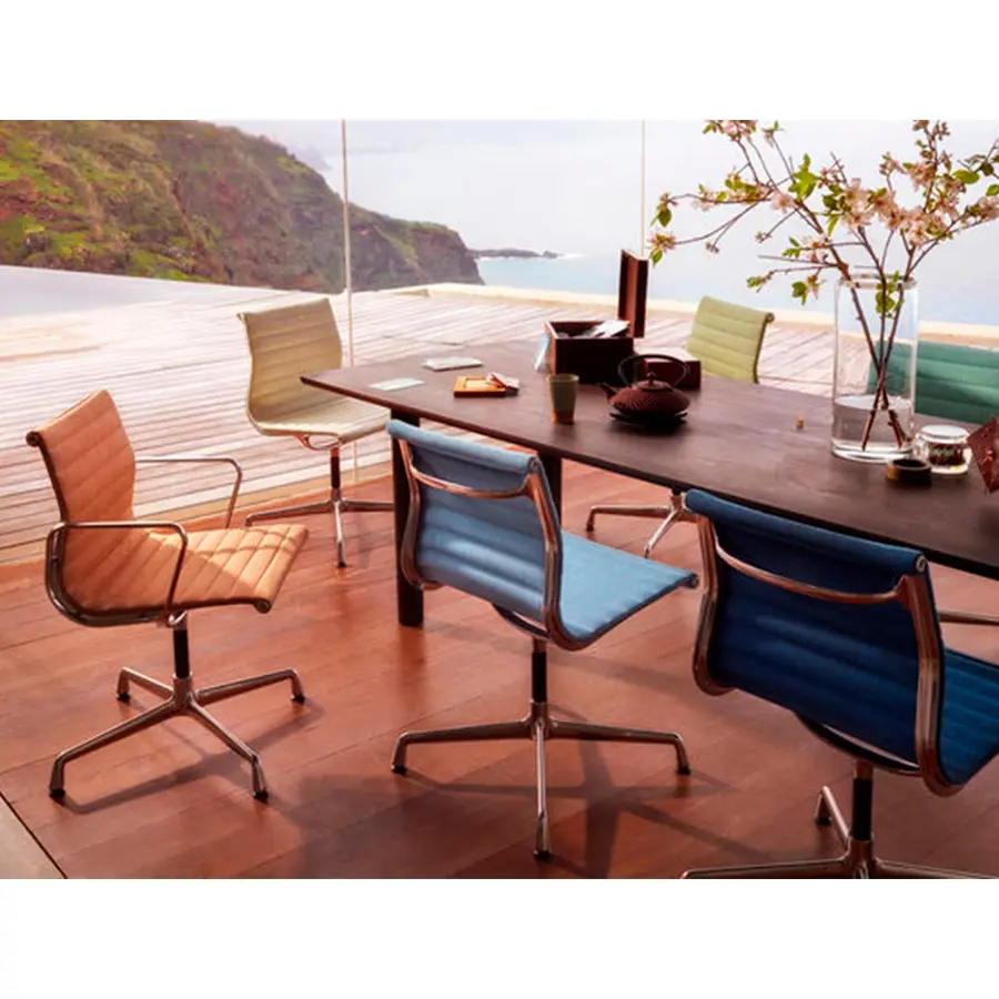 Las Aluminium Chairs EA 105-108 son la solución ideal para las salas de reuniones. Se encuentran en multitud de oficinas bien amuebladas, salas de conferencias y salas de reuniones de todo el mundo. Gracias a sus generosas proporciones y al resistente asiento elástico –un panel de cuero, tela o malla, tensado entre dos piezas de aluminio– las sillas son extraordinariamente cómodas. Y con una selección tan amplia de colores de tapizado, resulta sencillísimo encontrar la silla perfecta para cualquier interior.
