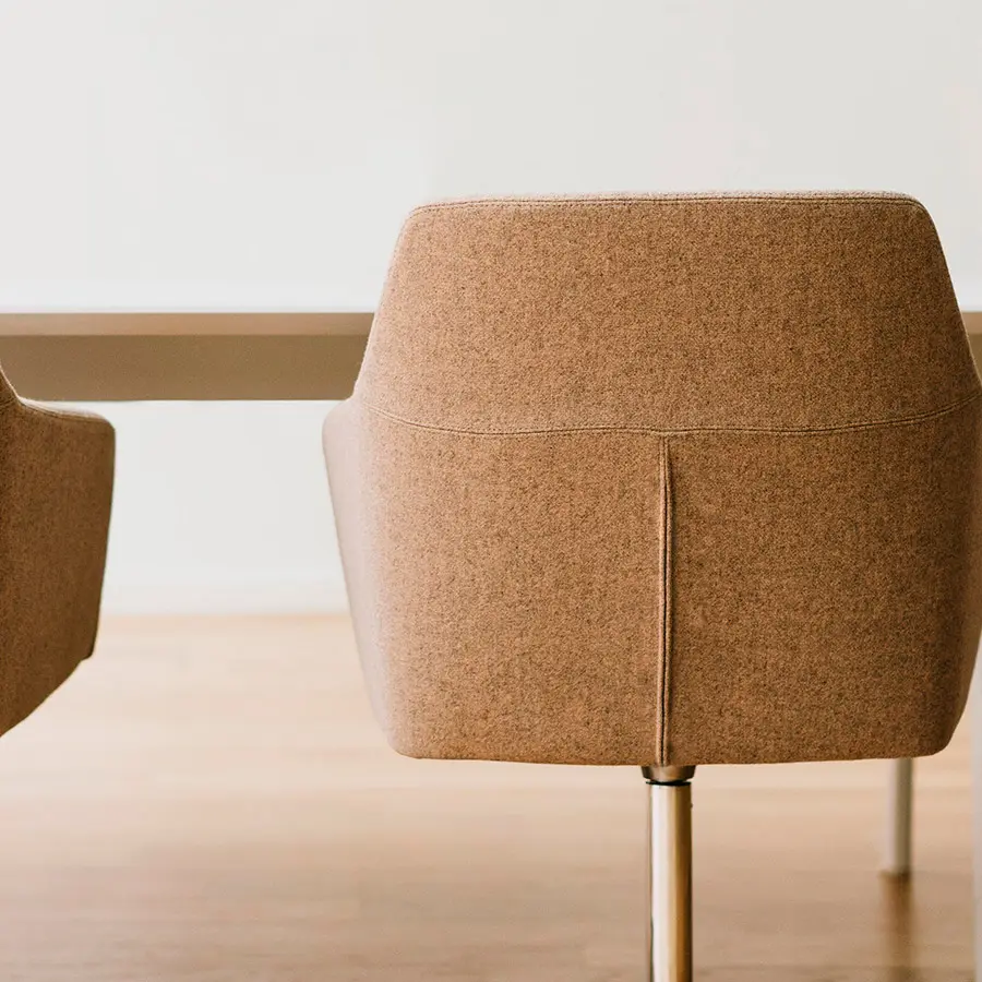 Butaca de respaldo bajo con asiento y respaldo tapizado y base central giratoria de 4 aspas de aluminio con sistema de retorno y acabado aluminio pulido.