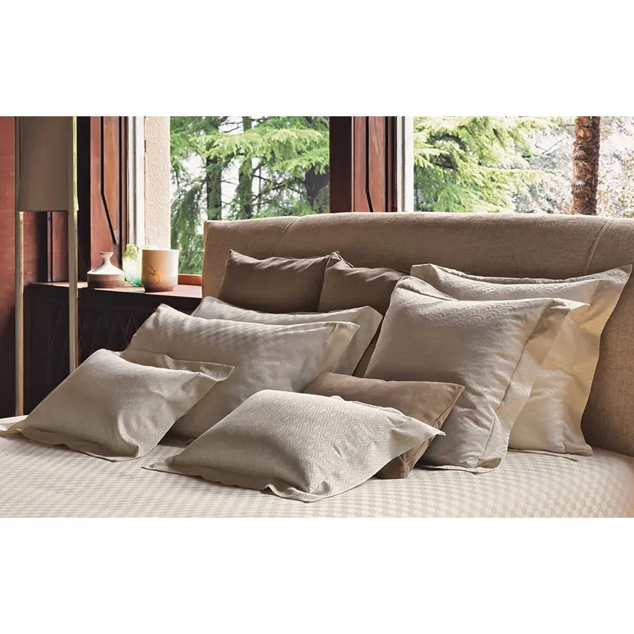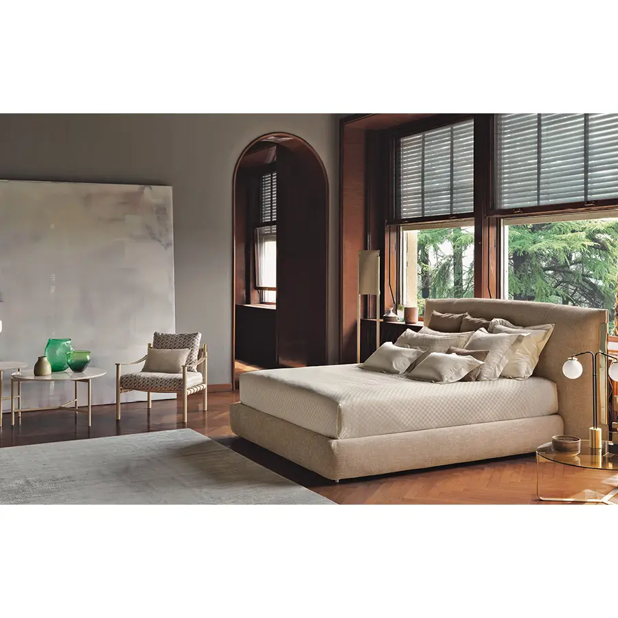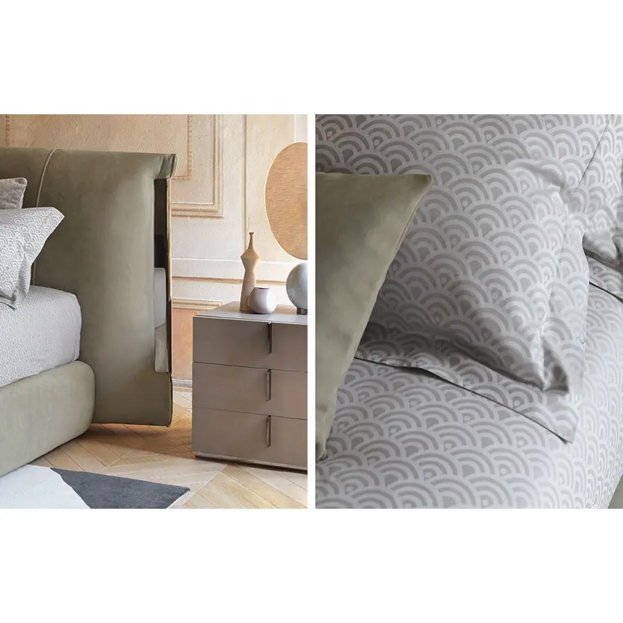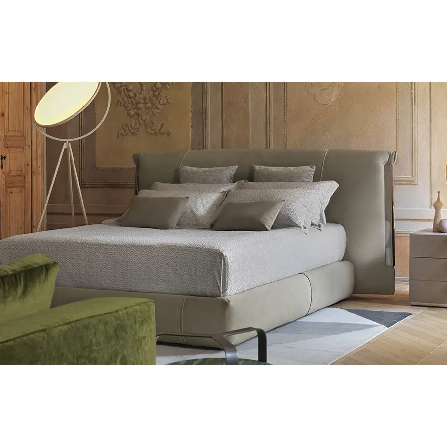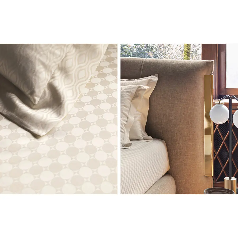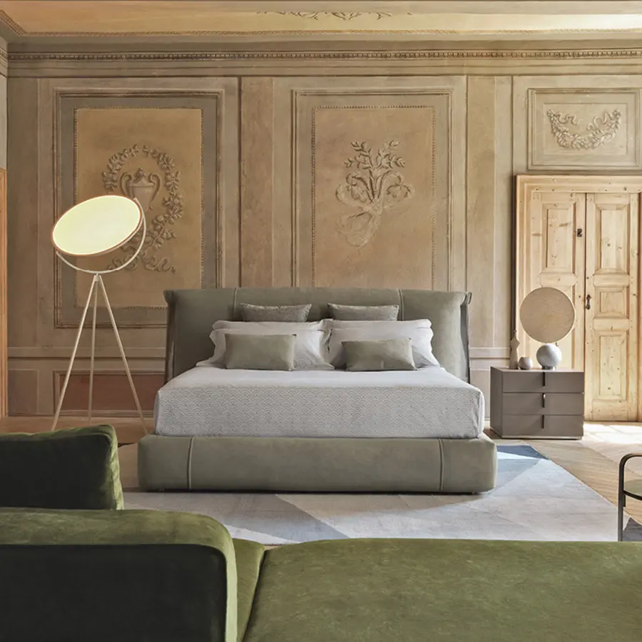La elegante cama de matrimonio Amal encaja en habitaciones prestigiosas. La enriquece el detalle elegante de los perfiles metálicos que, a los lados del cabecero, “pinzan” el revestimiento, ensalzando la suavidad del conjunto. Los tres acabados de los perfiles (oro brillo, bruñido mate, níquel negro brillo) han sido estudiados para facilitar la combinación con diferentes revestimientos. Disponible con base de muelles Leonardo, base contenedor o base con movimiento eléctrico. Base y cabecero, totalmente desenfundables, se pueden revestir con tejido, piel o Ecopelle.