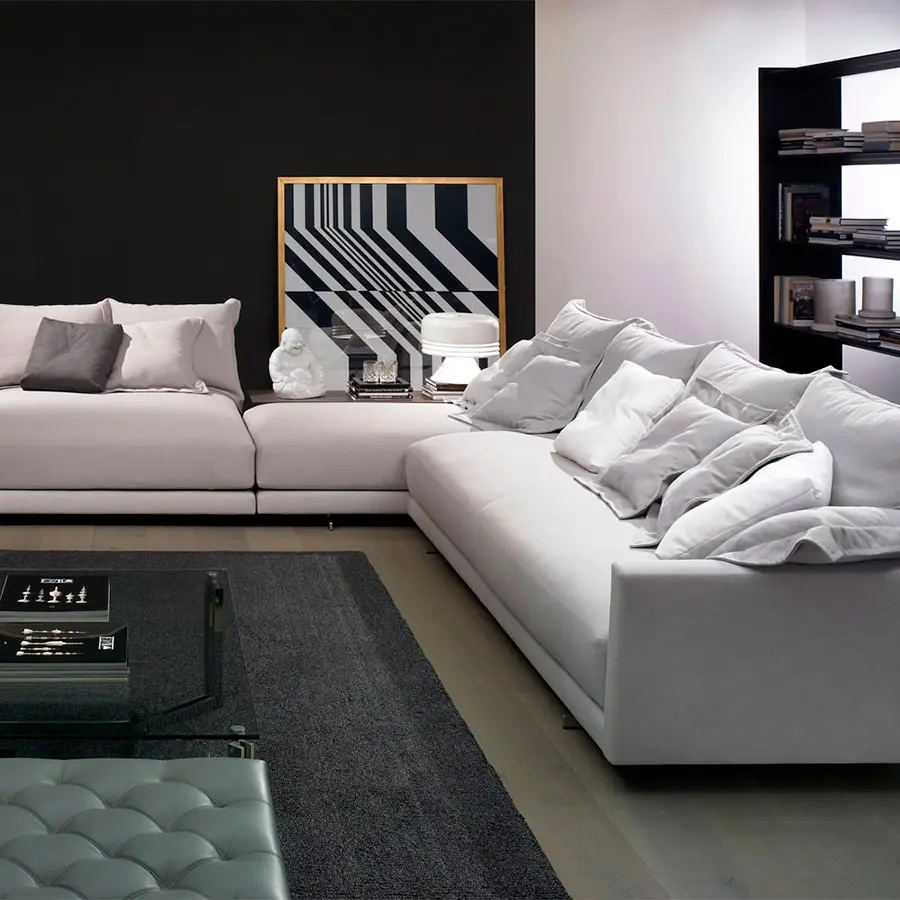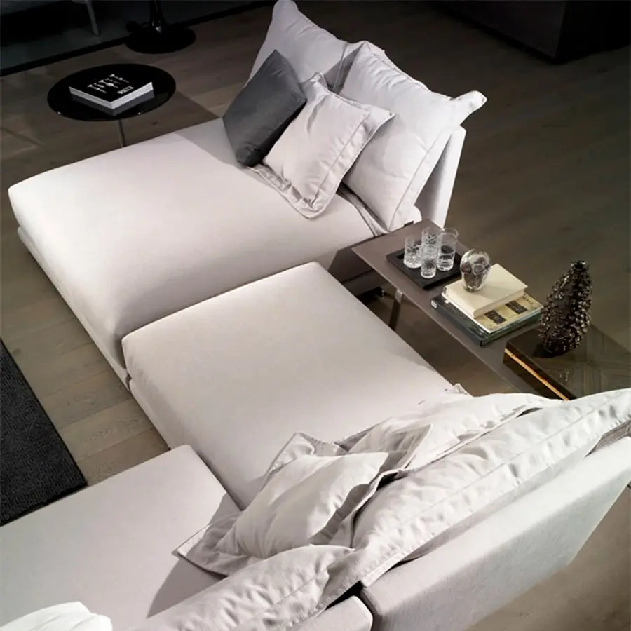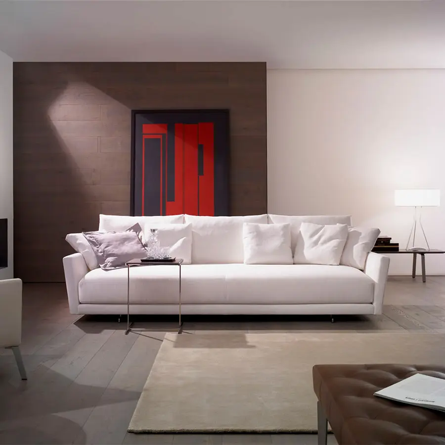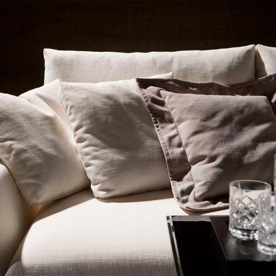 Cojín de asiento en espuma de poliuretano HR de diversas densidades de alta resilencia recubiertos con fibra de poliéster hueca y siliconada. Cojines de respaldo recubiertos de funda protector con divisiones internas. Rellenos con fibra de poliéster y pluma de pato blanca esterilizada. Totalmente desenfunde (estructura y cojines), excepto cuando se tapiza en piel o imitación de la misma.