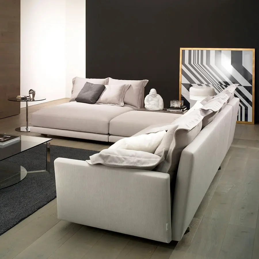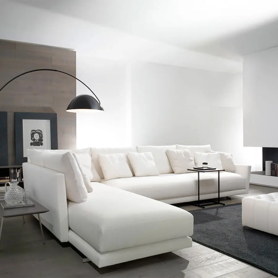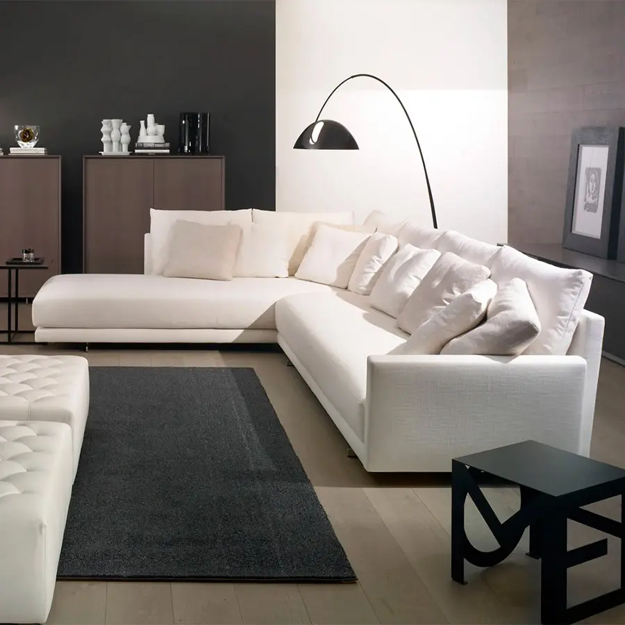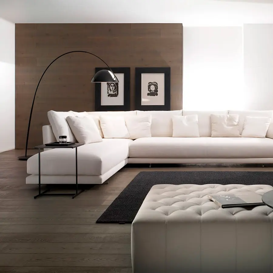 Cojín de asiento en espuma de poliuretano HR de diversas densidades de alta resilencia recubiertos con fibra de poliéster hueca y siliconada. Cojines de respaldo recubiertos de funda protector con divisiones internas. Rellenos con fibra de poliéster y pluma de pato blanca esterilizada. Totalmente desenfunde (estructura y cojines), excepto cuando se tapiza en piel o imitación de la misma.