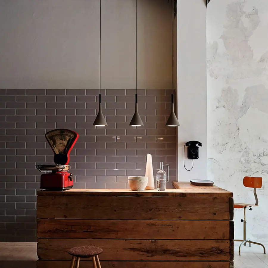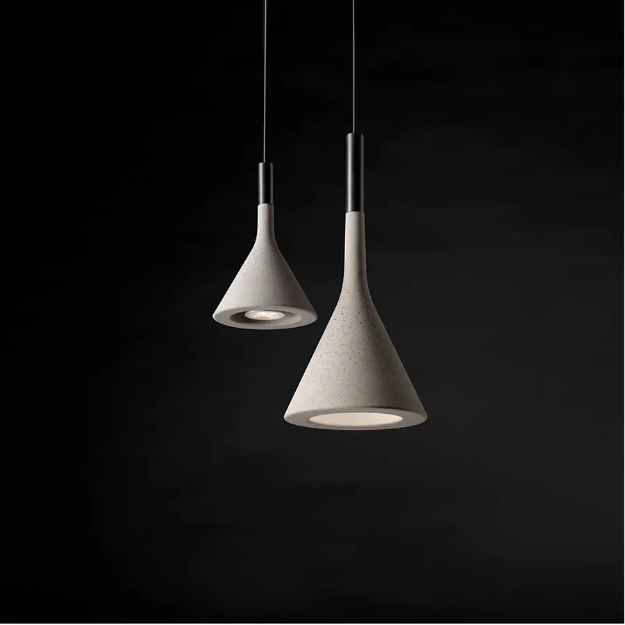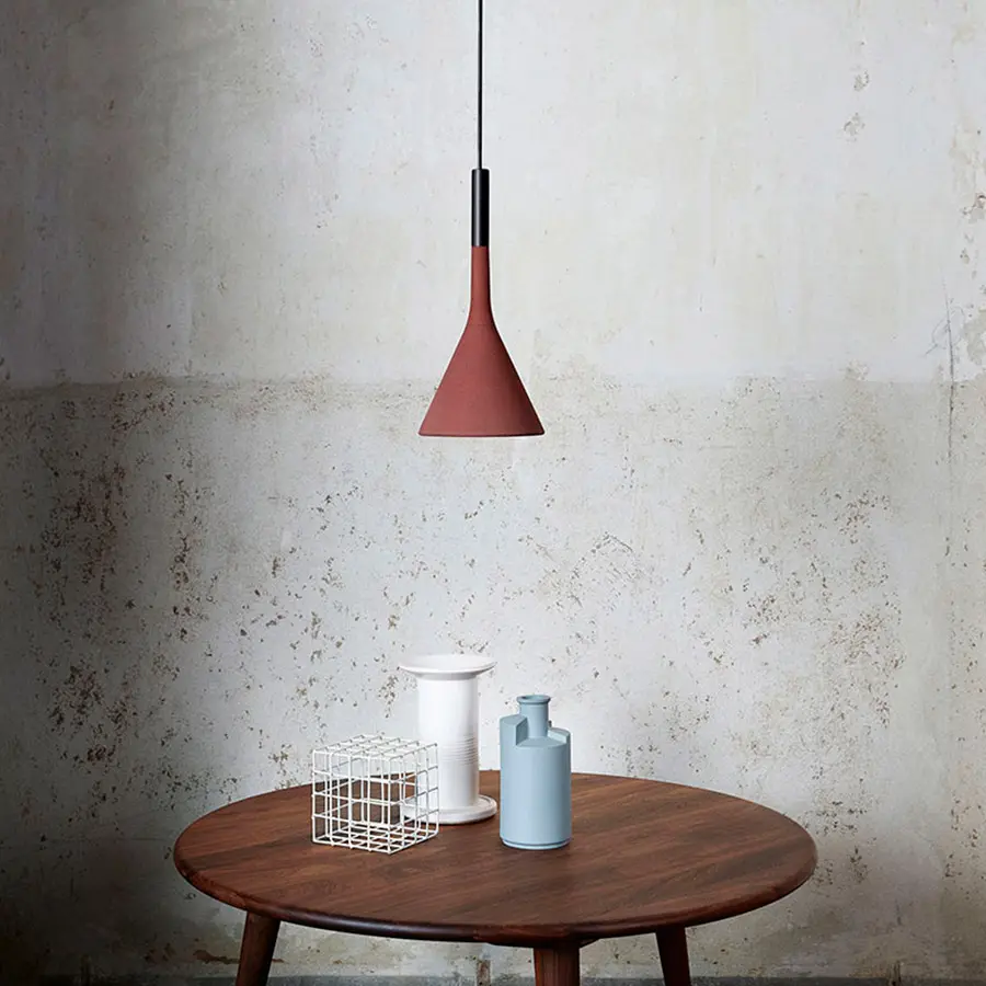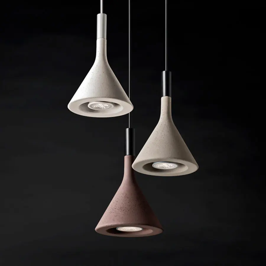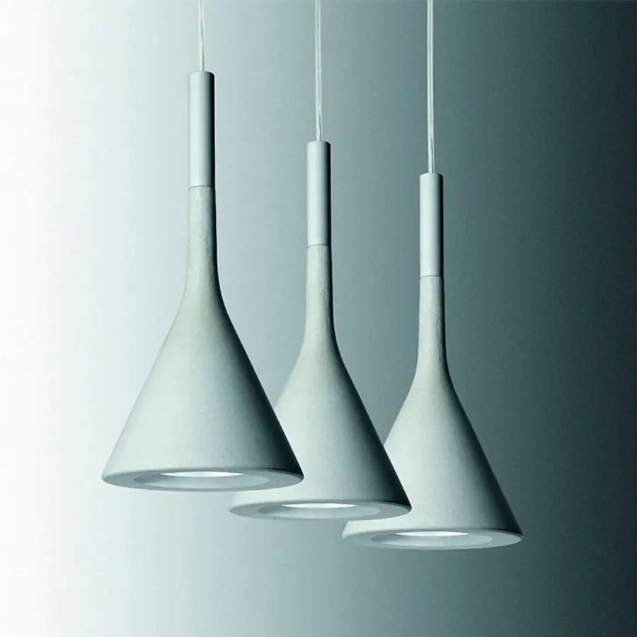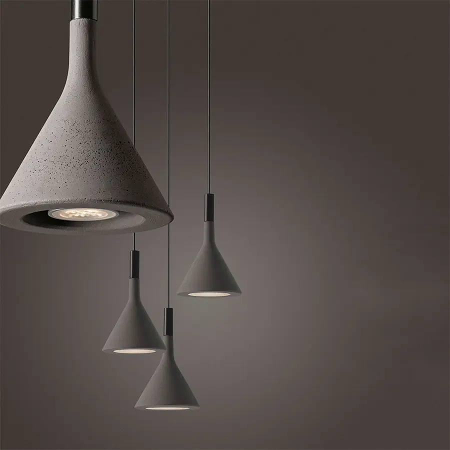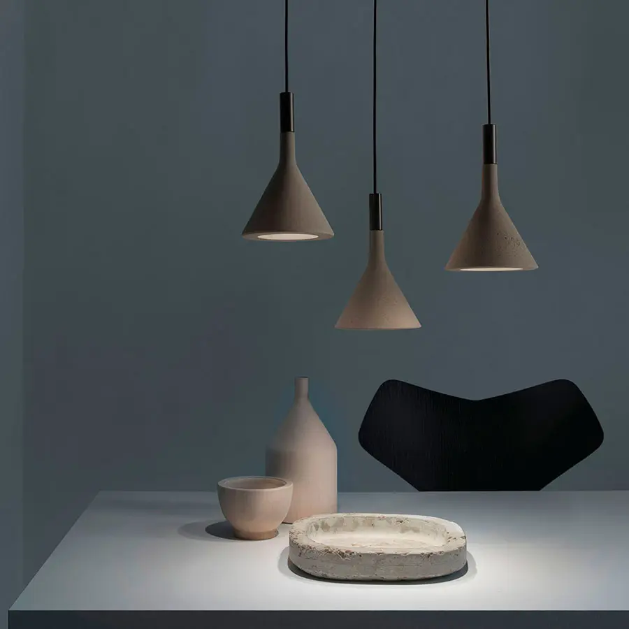 Aplomb es una pequeña lámpara de suspensión en cemento que permite crear una iluminación directa y puntual en el nivel inferior. El cemento a vista forma parte del lenguaje expresivo de la arquitectura moderna y Foscarini, con Aplomb, utiliza este material con un espíritu y una tecnología completamente originales. La lámpara muestra un rasgo ligero, de extrema elegancia y sencillez formal, que suaviza la maciza solidez del cemento exaltando el aspecto matérico, al mismo tiempo puro y refinado. Su tamaño reducido permite utilizarla sola, por ejemplo sobre una mesita, en filas para iluminar un nivel o también en composición con diversas alturas. La version GU10 es disponible en seis colores, con pigmentos añadidos directamente en la mezcla de cemento, valoriza de forma distinta la personalidad de la lámpara: el gris natural destaca la matericidad, el marrón añade una nota cálida e intensa, mientras el blanco pone de manifiesto su elegancia. Rojo oscuro, amarillo arena y verde oliva son los colores que acompañan las tonalidades ya presentes en el catálogo.