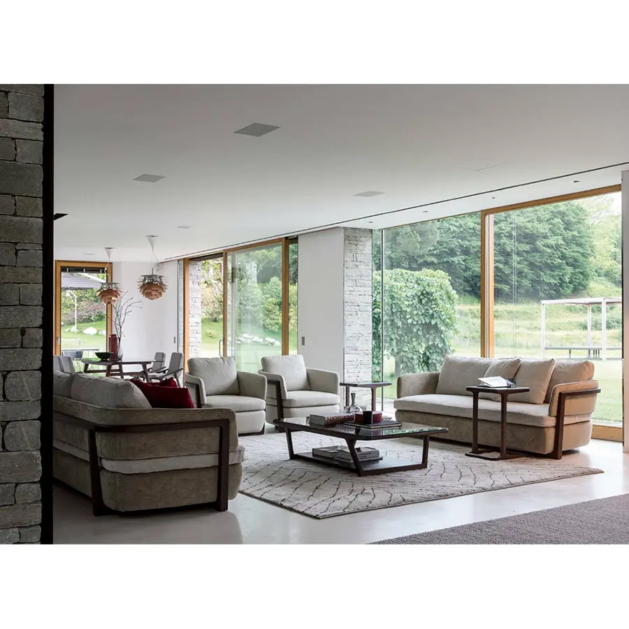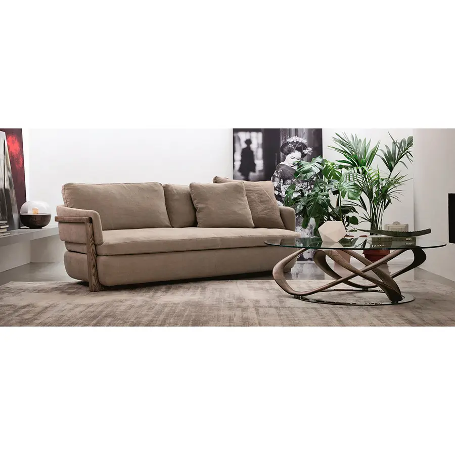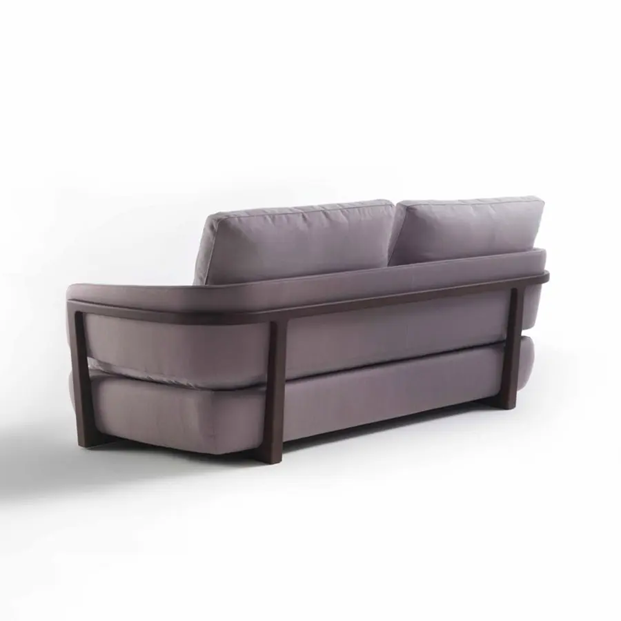 Sofá con estructura en fresno macizo y revestimiento en las telas de la colección. Es posible combinar diferentes telas entre estructura revestida de la base y del respaldo y cojines de asiento y respaldo. Cojines desenfundables. Disponible en dos dimensiones: 224x96x75H – 147x96x75