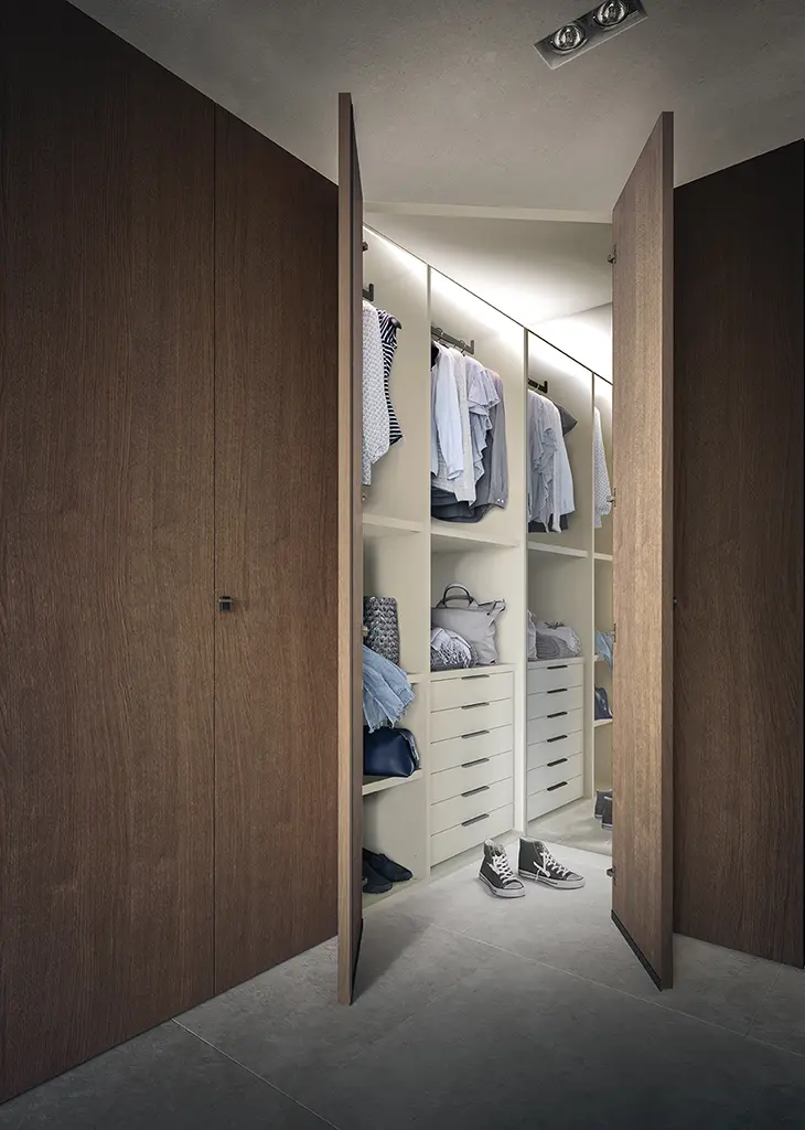 Los armarios de puertas batientes son la solución perfecta cuando se quiere ver todo el contenido del armario de una sola vez, sin puertas que se solapen. Todos los componentes y materiales de los armarios de puertas batientes modernos son de gran calidad. Las bisagras, fabricadas con materiales de vanguardia, están probadas para más de 80.000 ciclos de apertura y garantizan durabilidad y fiabilidad a lo largo del tiempo.