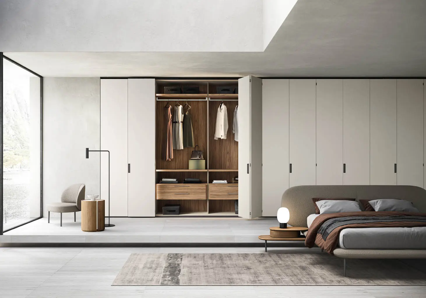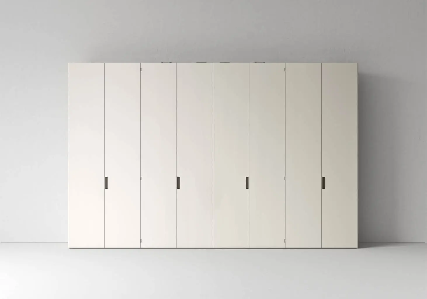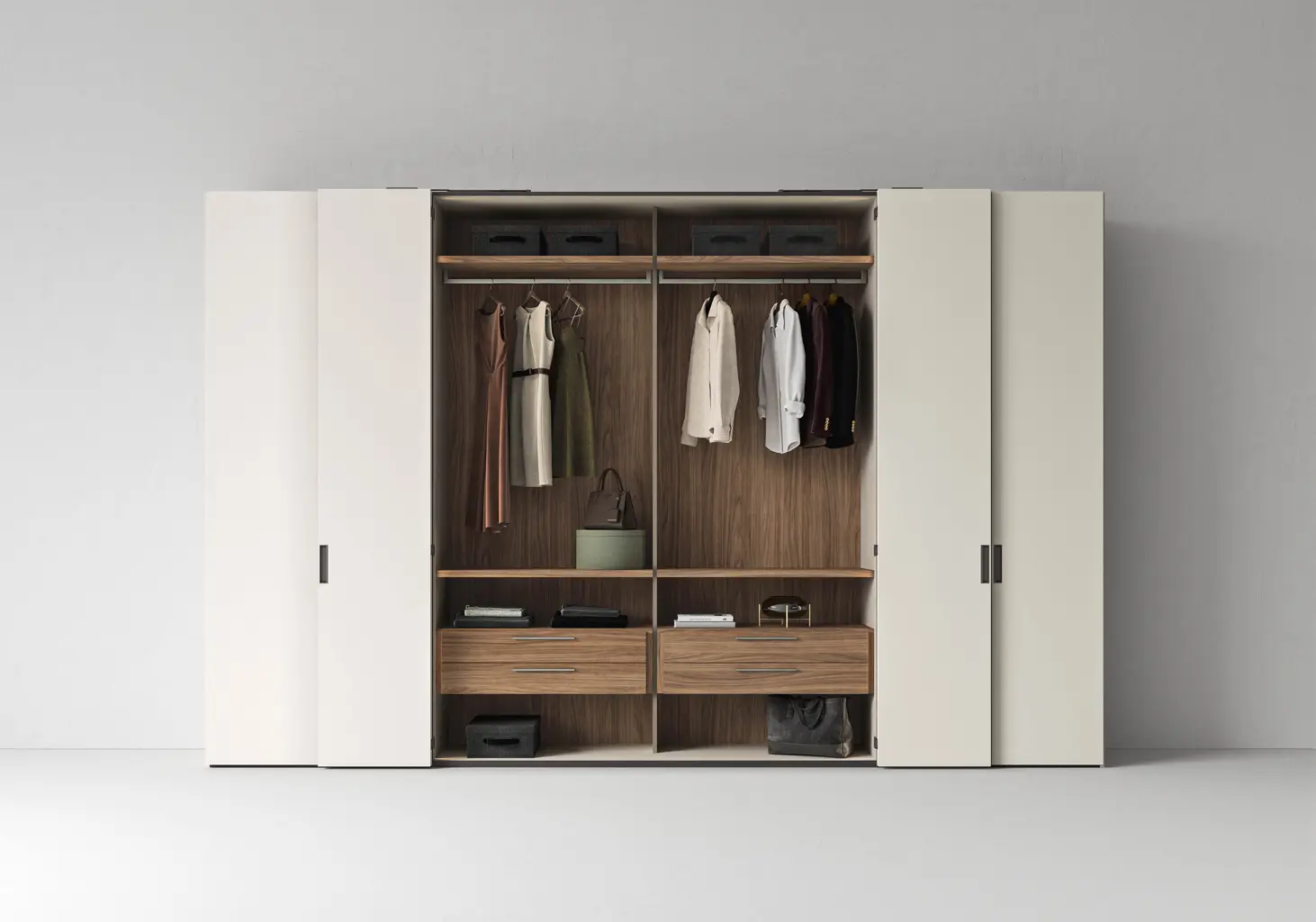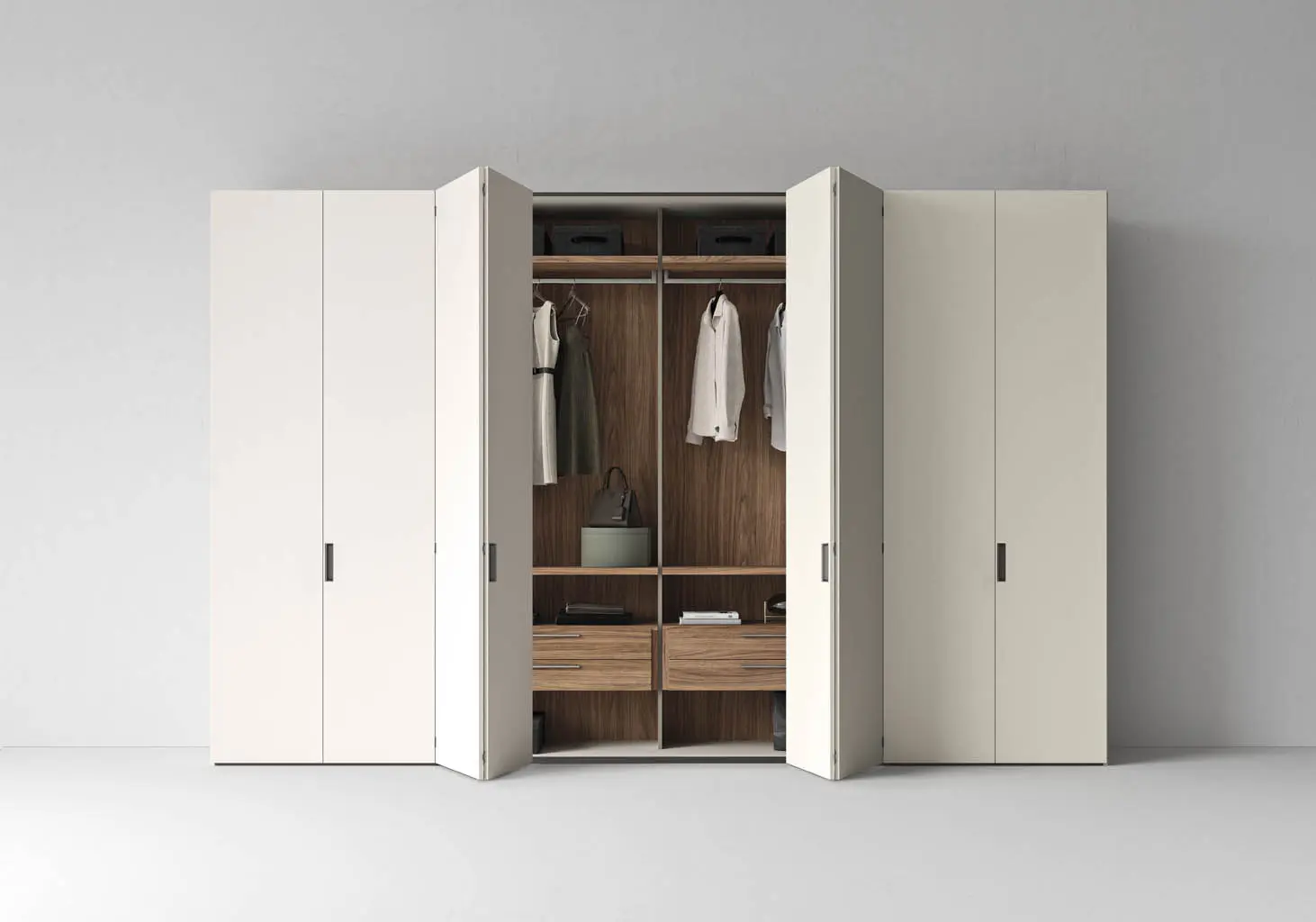 Los armarios Poker total view cuentan con un nuevo módulo «doble» con división central entrante para un mejor aprovechamiento del espacio interior, gracias también al innovador sistema de apertura plegable de las puertas.