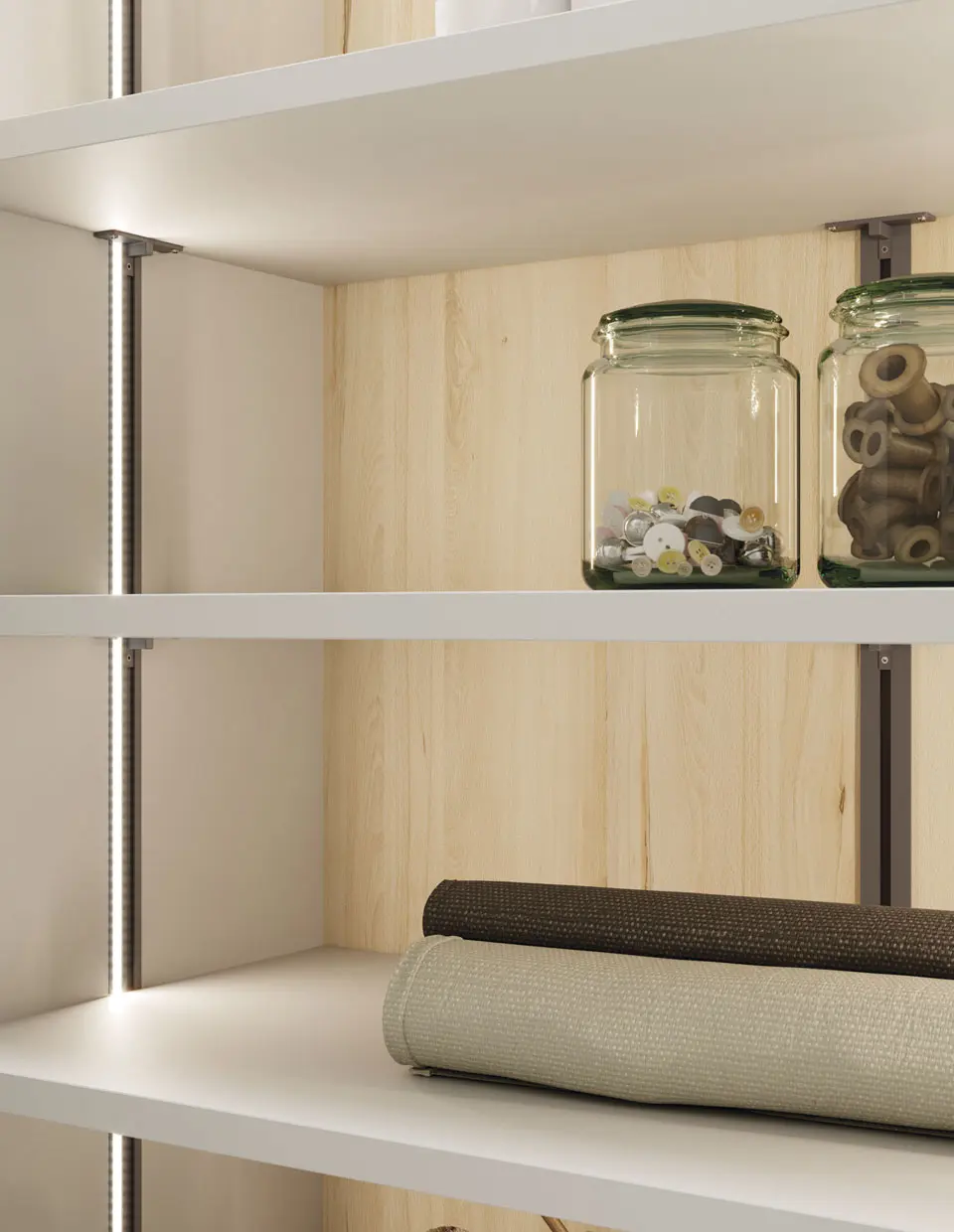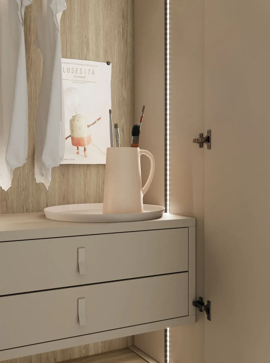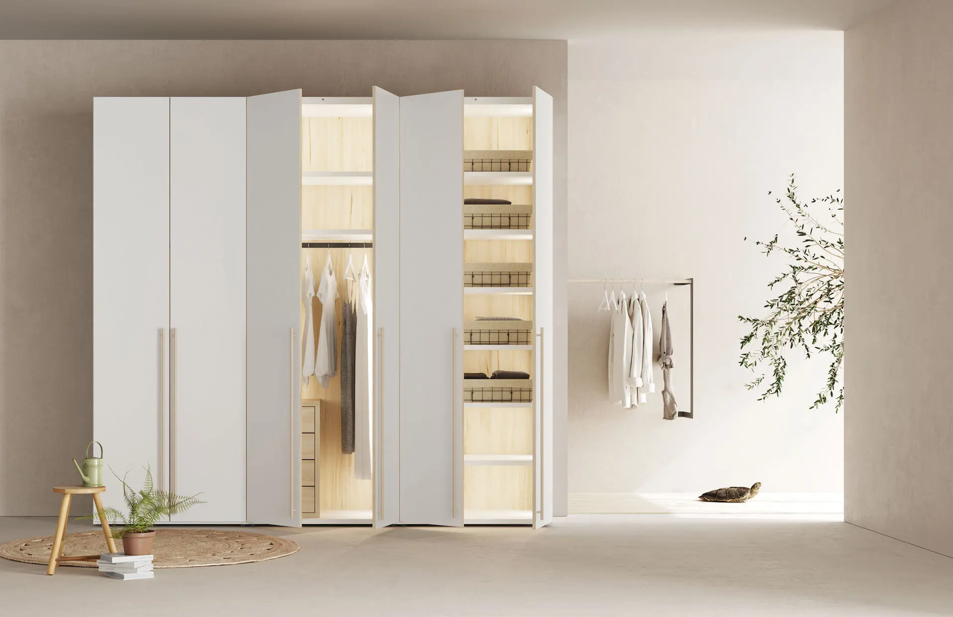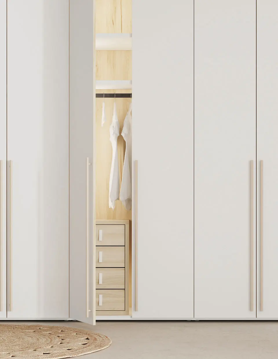 La colección de armarios con puertas batientes dispone de una gran variedad de medidas, puertas y acabados que puedes combinar para que tengas el armario que más se adecúe a tu espacio y a tu manera de vivir. En cuanto a su sistema, es sencillo y seguro. Incorporan unas bisagras de muy buena calidad, para que las puertas alarguen muchísimo su vida. Importantísimo recalcar la calidad de nuestros muebles y materiales, que cumplen los controles más estrictos. El sistema de guías en los cajones nos aportará mayor flexibilidad para organizar y crear nuestro armario, así como la incorporación de luces LED y muchos otros detalles a tu disposición que harán que tu armario sea único.