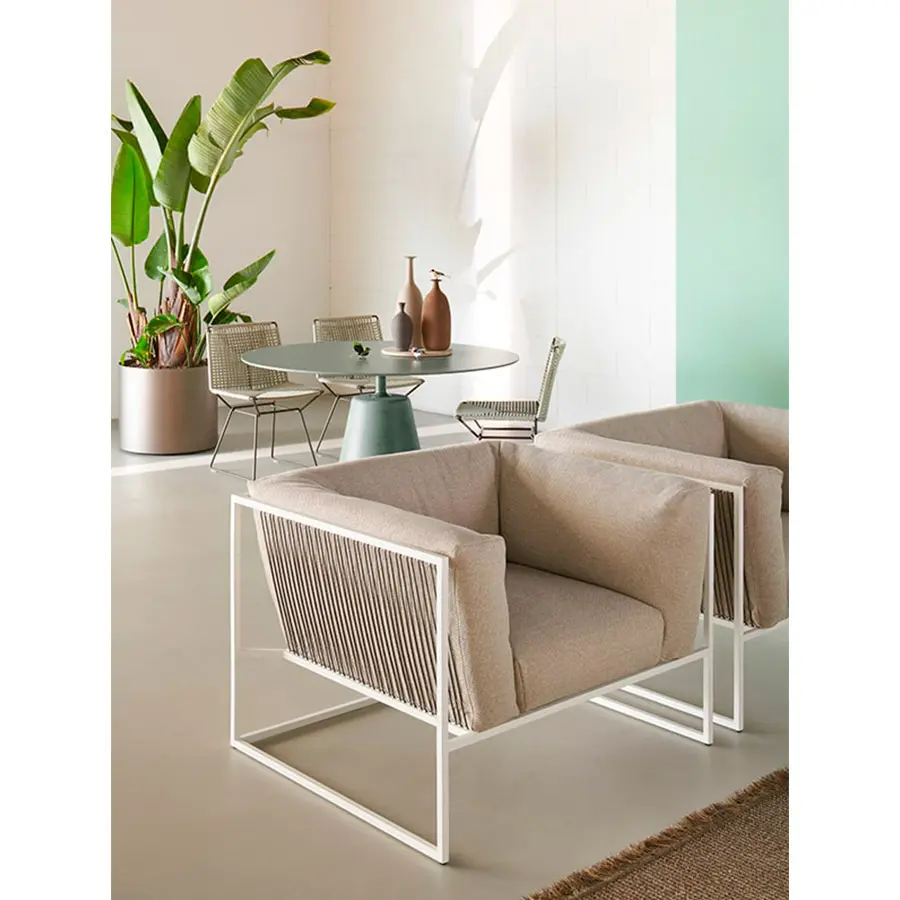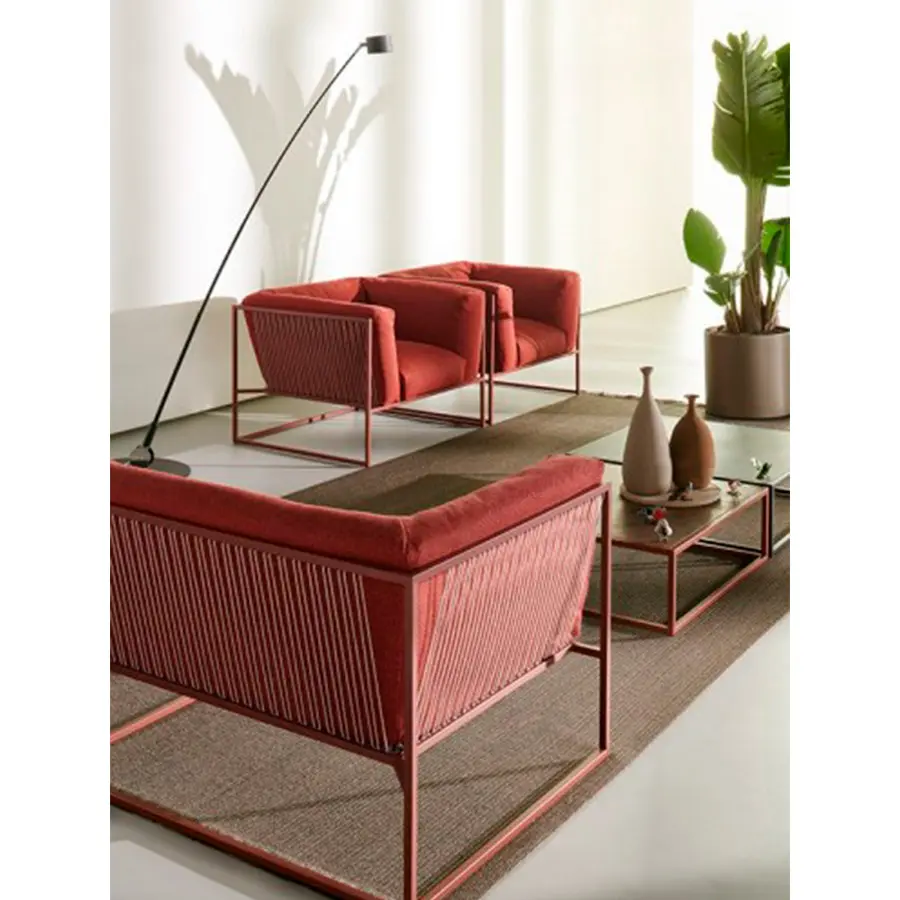 La colección ARPA combina la estabilidad de la forma externa ortogonal con la suavidad y comodidad de la funda del cojín interior. Las cuerdas finas agregan elegancia y finura a cada pieza, dando una sensación especial de ligereza, como si toda la masa del cojín colgara de la estructura.