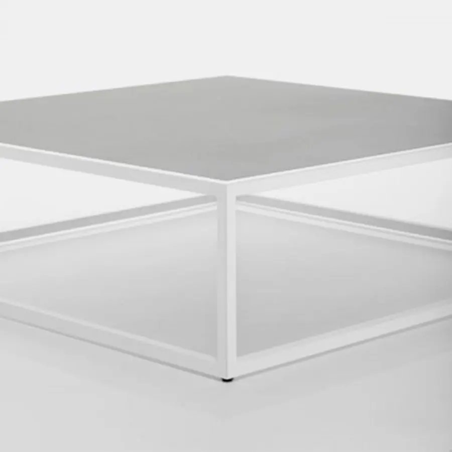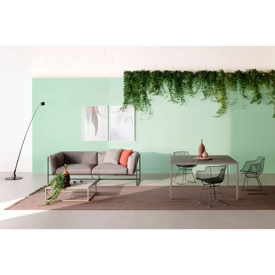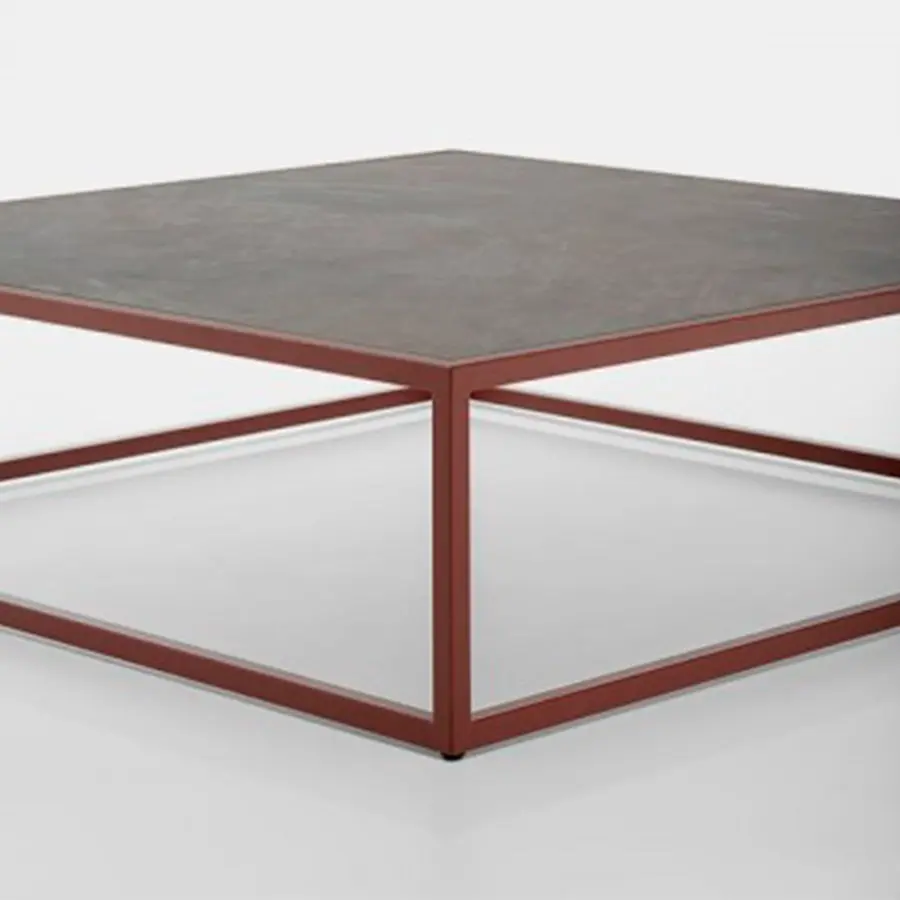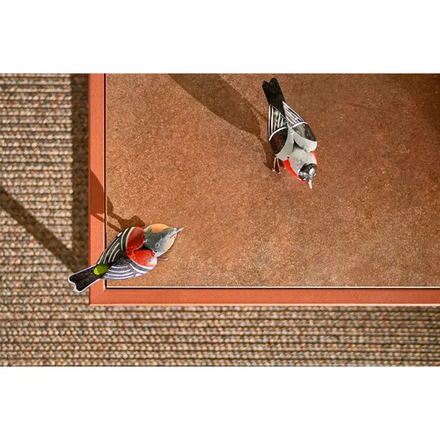 Estructura de soporte de carga en acero inoxidable, sección de 2 x 2 cm, recubierta de polvo epoxi con tratamiento específico para uso en exteriores. Sobre de laminado fino de gres porcelánico, variaciones mate en gris claro o negro. Bush martilló pietra di Savoia gris medio y corten satinado natural.