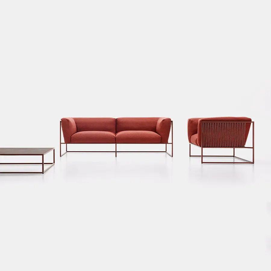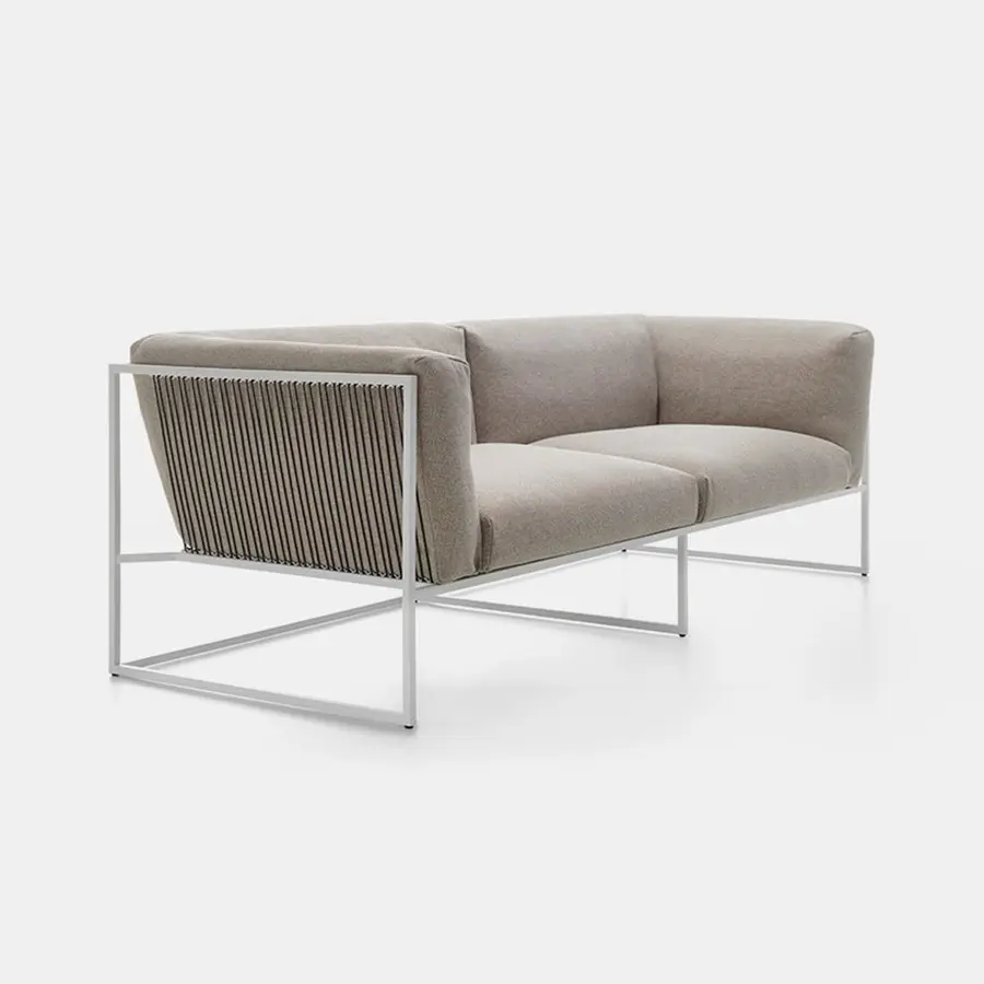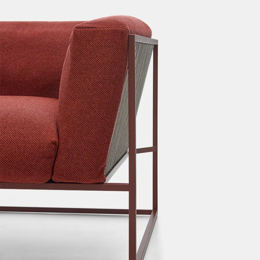 La colección ARPA combina la estabilidad de la forma ortogonal externa con la suavidad y comodidad de la funda del cojín interno. Los finos cordones aportan elegancia y finura a cada pieza, dando una especial sensación de ligereza, como si toda la masa del cojín estuviera suspendida de la estructura.