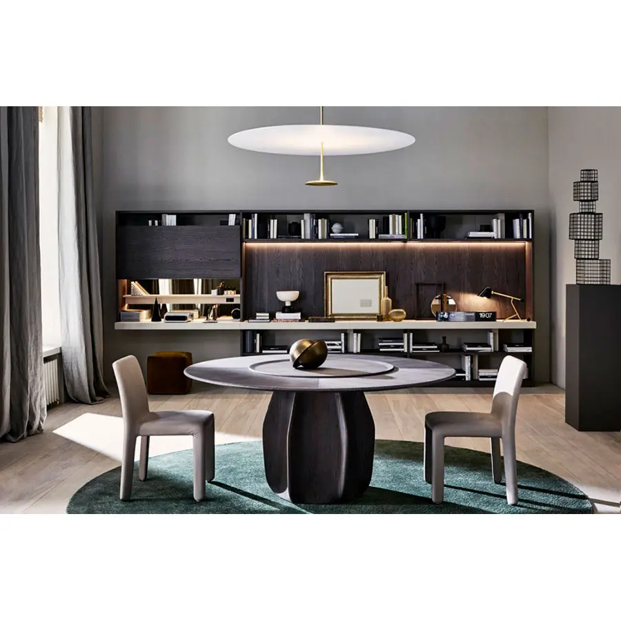 Asterias, planta cactácea originaria de las zonas montañosas de México, da el nombre a este nuevo proyecto de Patricia Urquiola. Una mesa redonda de tamaño generoso, caracterizada por una base central que recuerda el cactus del que toma el nombre. Se compone justamente de seis paneles de madera curvada, en forma de gajo, aplicados en saliente en el plinto central. Los paneles están realizados con la peculiar técnica de la impresión 3D. El sobre (160 o 180 cm), de borde redondeado, en versión en madera está repartido en tres gajos que plasman un interesante diseño geométrico. Además, la mesa dispone de un accesorio práctico: un plato giratorio central (Lazy Susan), muy apreciado en los países asiáticos.