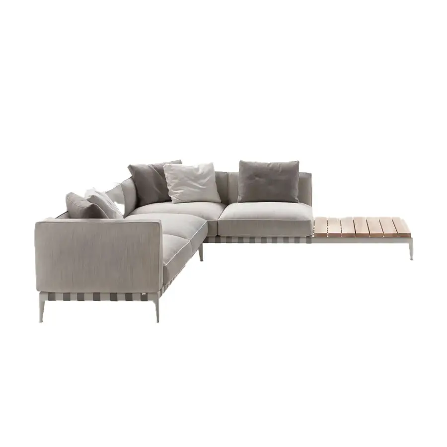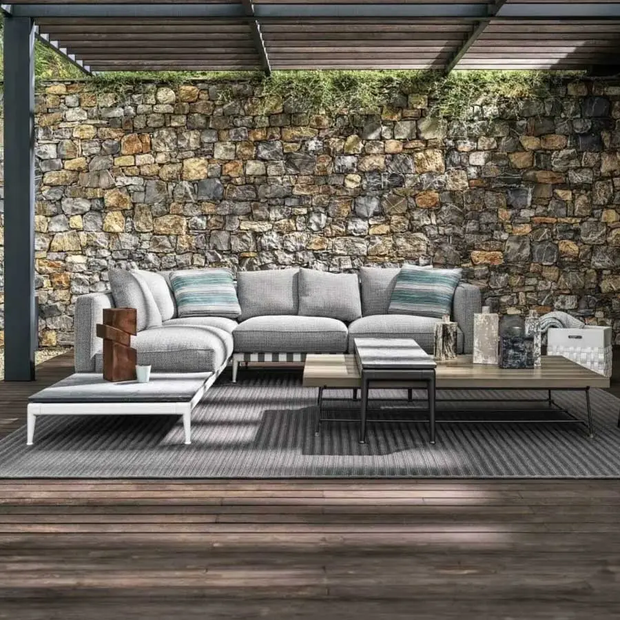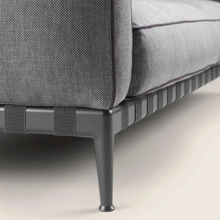 La base del sofá es de acero inoxidable recubierta con correas elásticas hidrófugas, mientras que las patas de aluminio fundido a presión aportan una estética suave y armoniosa. El sofá Atlante es rico en detalles de confección que subrayan su alto grado de personalización: la base metálica está pintada con polvos epoxídicos en una serie de colores refinados, mientras que las correas elásticas están disponibles en arena, gris y antracita para crear un agradable contraste o un suave efecto tono sobre tono.