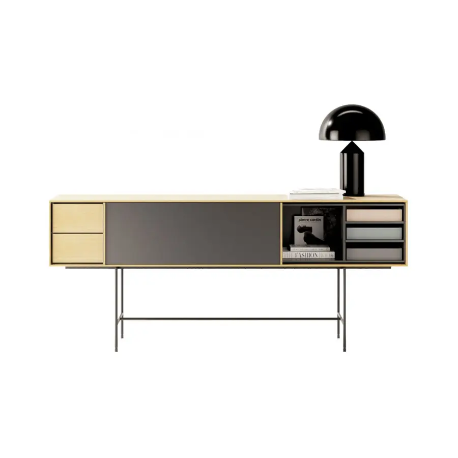 Composición en roble teñido en tono tobacco con laca grafito. Los cajones se sustituyen por pequeñas cajitas de tela plastificada y que combinan con módulos de puertas y abiertos. Bastidor metálico que le da una estética que modernista al mismo tiempo que vintage.