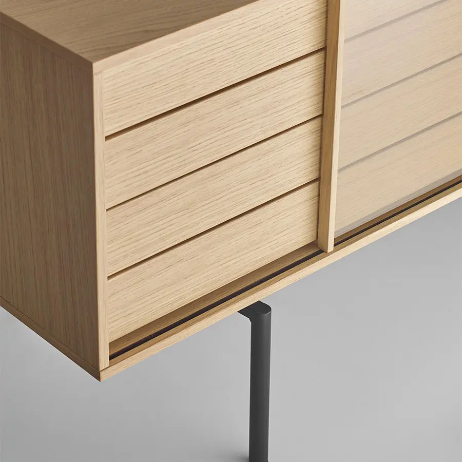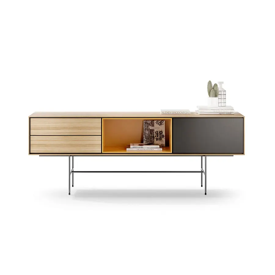 La colección Aura ha sido concebida como un programa para configurar principalmente aparadores y muebles para las zonas de salón/comedor. Su diseño está inspirado en tiempos pasados y bajo la influencia de la cultura del diseño de los paises nórdicos, que han sabido unir tradición y naturalidad con grandes dosis de modernidad. El resultado: una colección llena de memoria que desprende un aura muy actual. Los pies metálicos y de madera diseñados especialmente para la colección refuerzan esa imagen retro/atemporal. Especial importancia tienen los acabados seleccionados: la madera de nogal y roble con una acabado hiper-natural y los lacados que combinan perfectamente entre sí con las maderas.