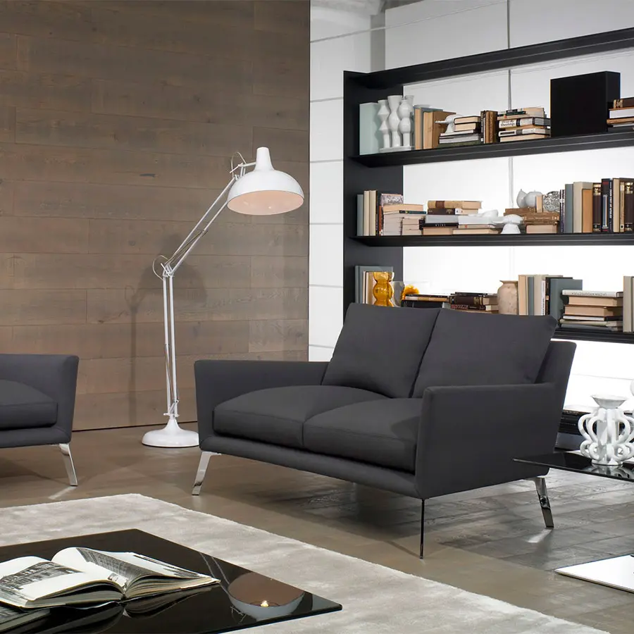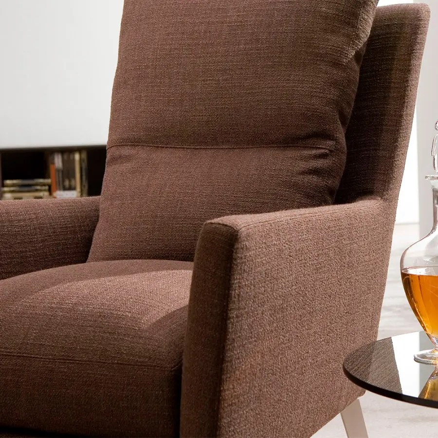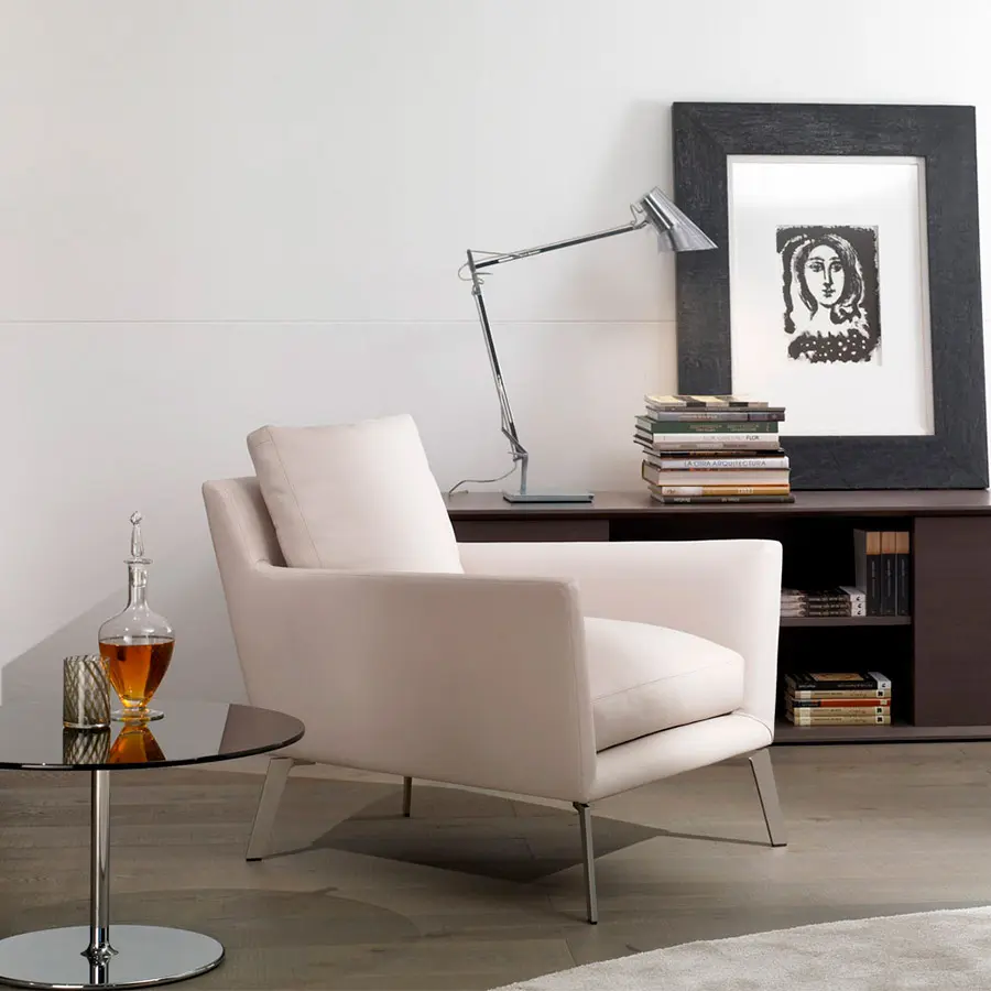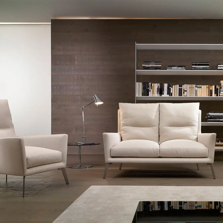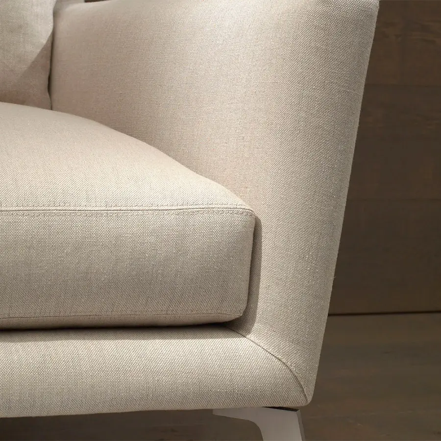 Estructura de madera recubierta de espuma de poliuretano de varias densidades y fibra hueca de poliéster siliconada. Cojín de asiento en espuma de poliuretano HR de varias densidades de alta resiliencia y funda protectora con divisiones internas rellenas de plumas de pato blancas esterilizadas. Cojines de respaldo revestidos de funda protectora con divisiones internas. Relleno de fibra de poliéster y pluma de pato blanca estilizada. Pies en acero cromo brillo o níquel mate, desmontables con tornillos.